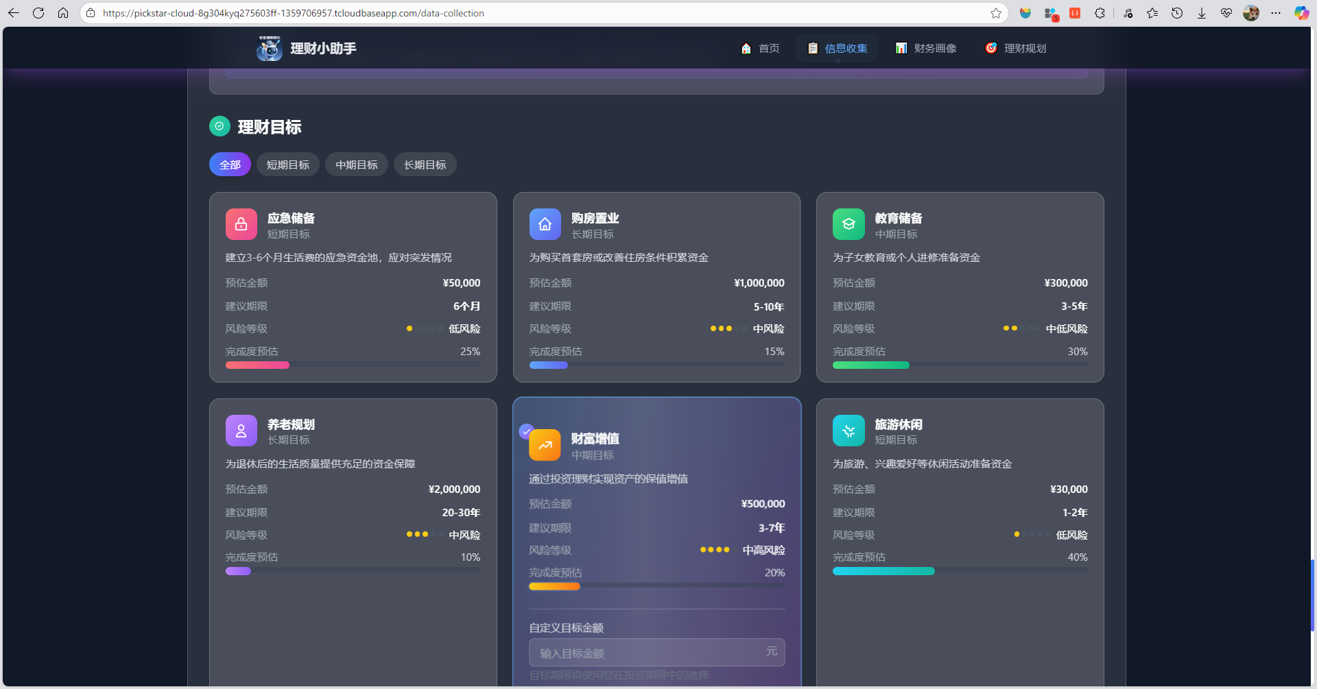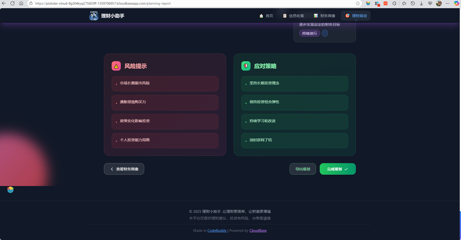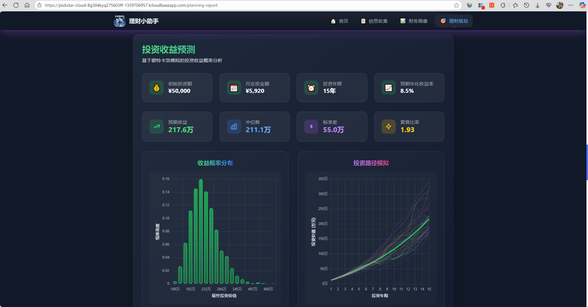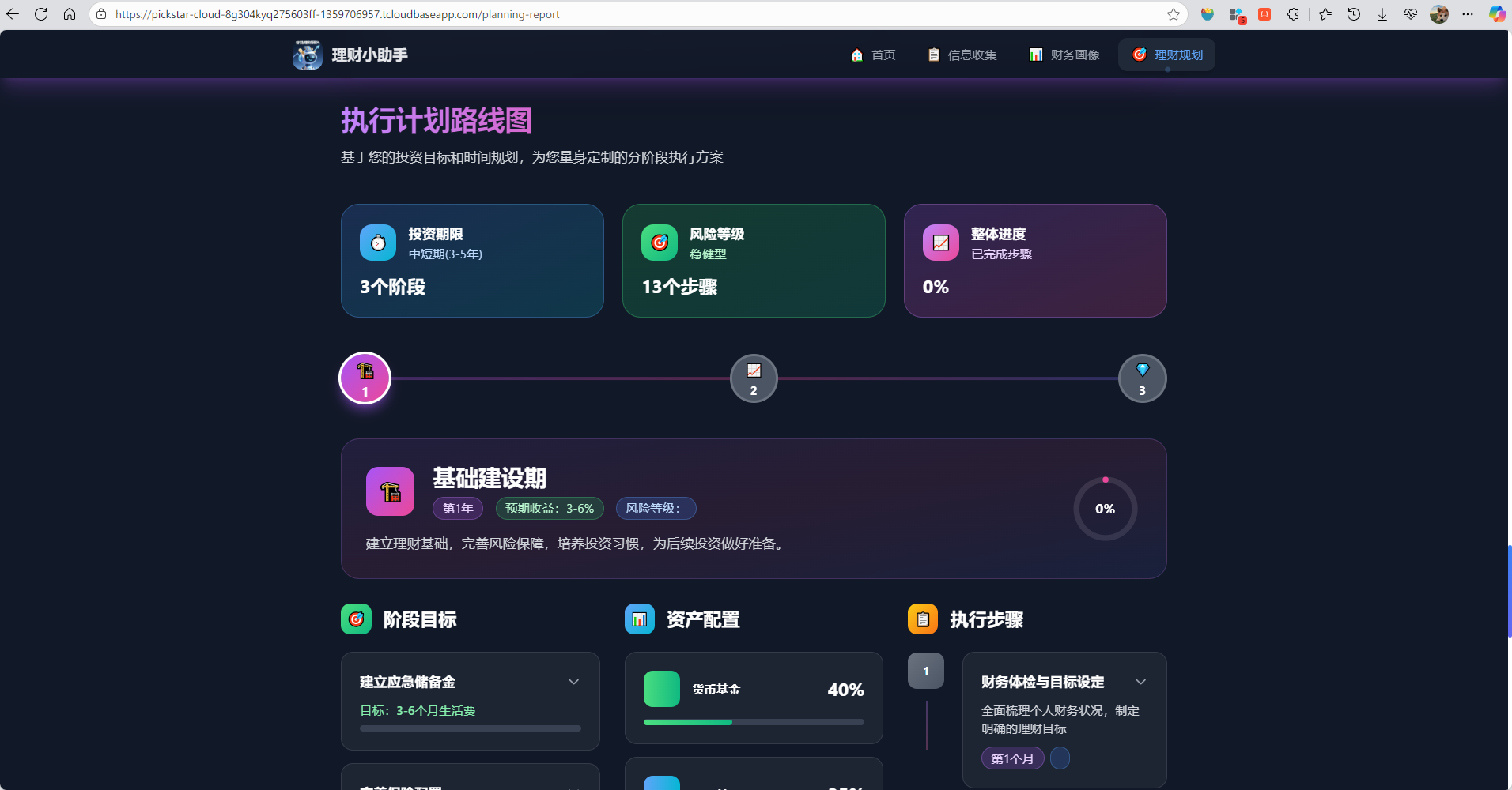 6. 标准化报告生成:将所有分析结果整理为可视化结构化数据,包含用户画像、财务指标、风险评级、目标分析等模块展示(可自行扩展)
