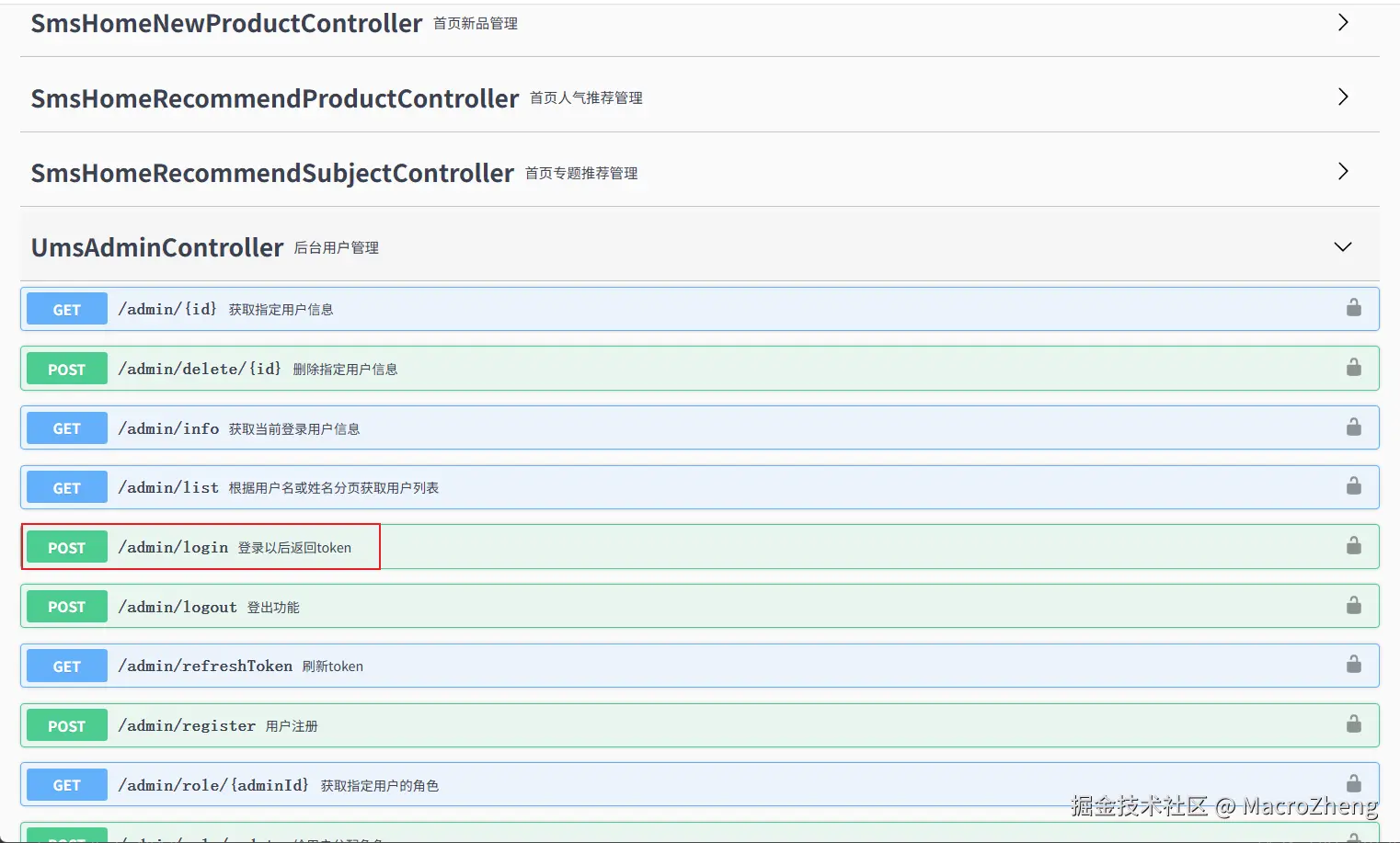 后台用户登录获取token的接口,接口文档地址:admin-api.macrozheng.com/swagger-ui/