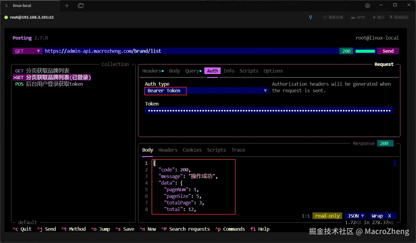分页获取品牌列表的接口,可以获取到品牌列表信息,在Posting的auth中会自动添加认证请求头信息。