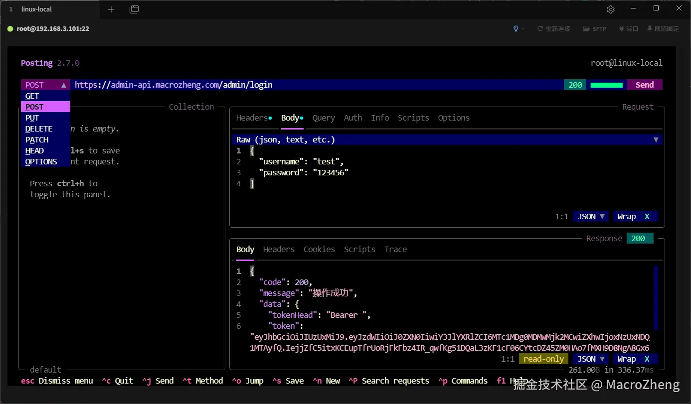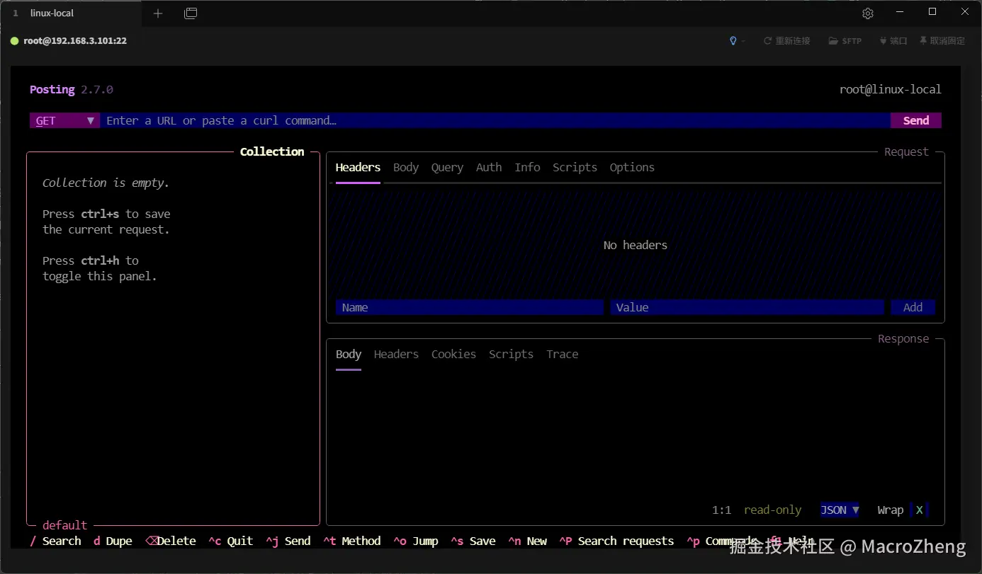 Posting是一款可以在终端中使用的接口调试工具,目前在Github上已有9.3k+Star!Posting作为一款TUI应用,可以通过SSH进行使用,并支持高效的基于键盘的工作流程。如果你在Linux终端中想要进行接口调试的话,可以试试它。