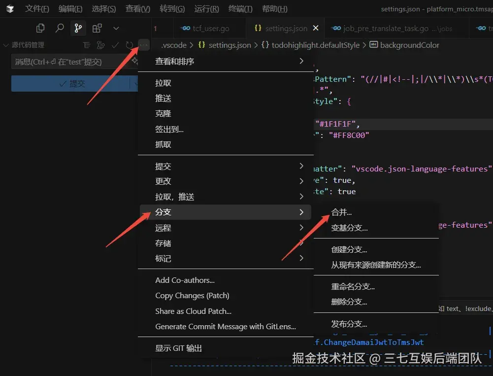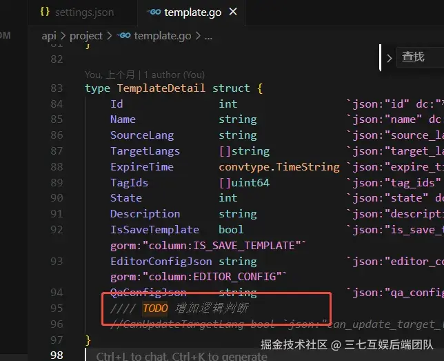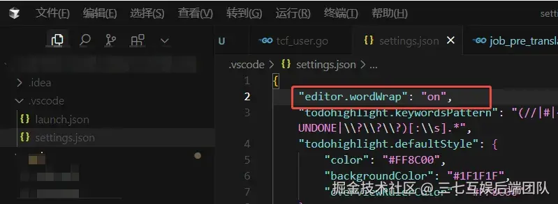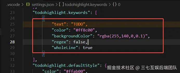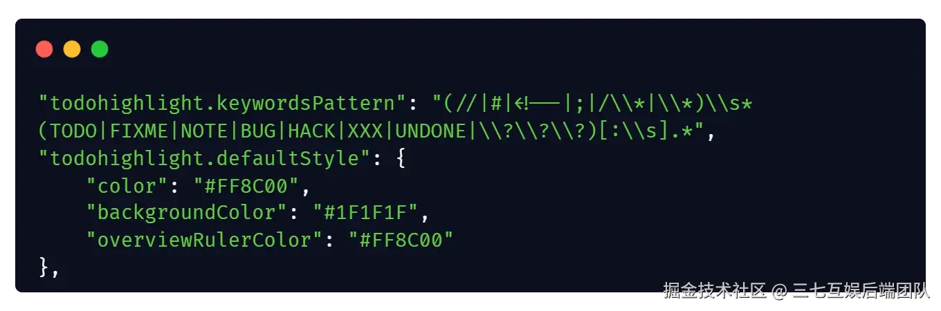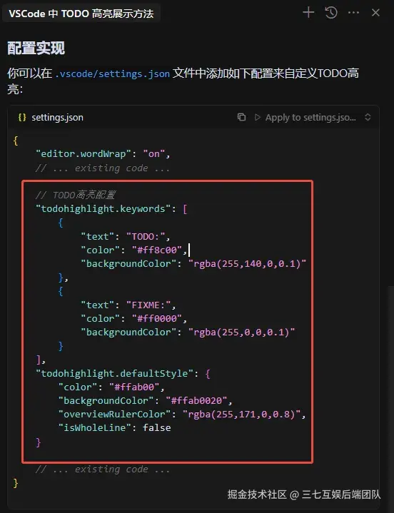 使用"todo highlight"插件实现TODO注释高亮。在.vscode/settings.json中添加: