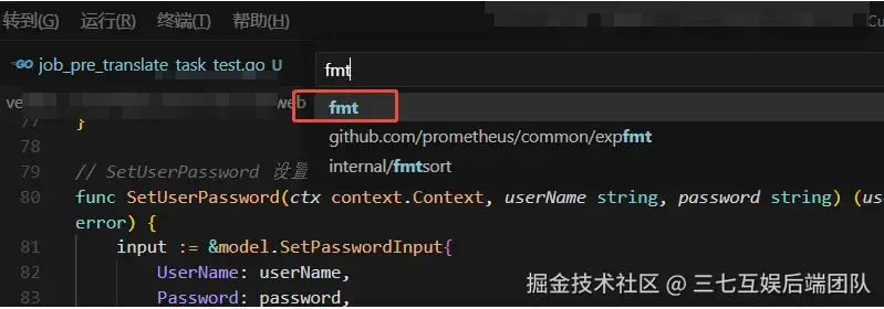 按Ctrl+Shift+P打开命令面板,输入"Import",在包选择页面输入需要导入的包名(如"fmt")。