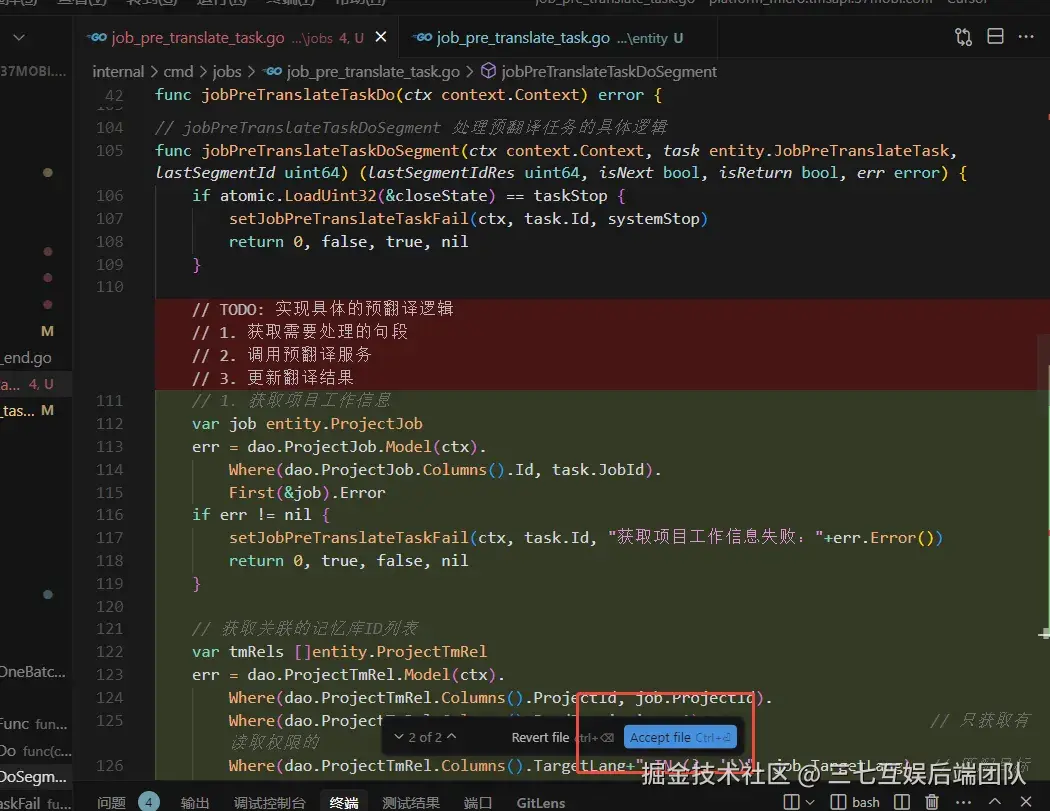 而且当冲突内容跨很多行时,很容易忘记这段代码插入后在新文档的位置,我感觉是完全不如其他三路合并工具的,大家有其他好用的轻量级三路合并工具也欢迎留言推荐,goland会慢一点。