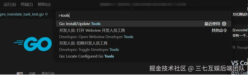 ctrl+shift+p 开启快捷命令输入 tools。看到一个Go: Install/Update Tools 选择后安装即可。