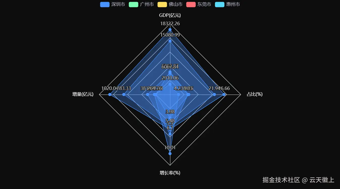 - 深圳全面领先:在GDP规模、增量和占比方面均大幅领先其他城市。