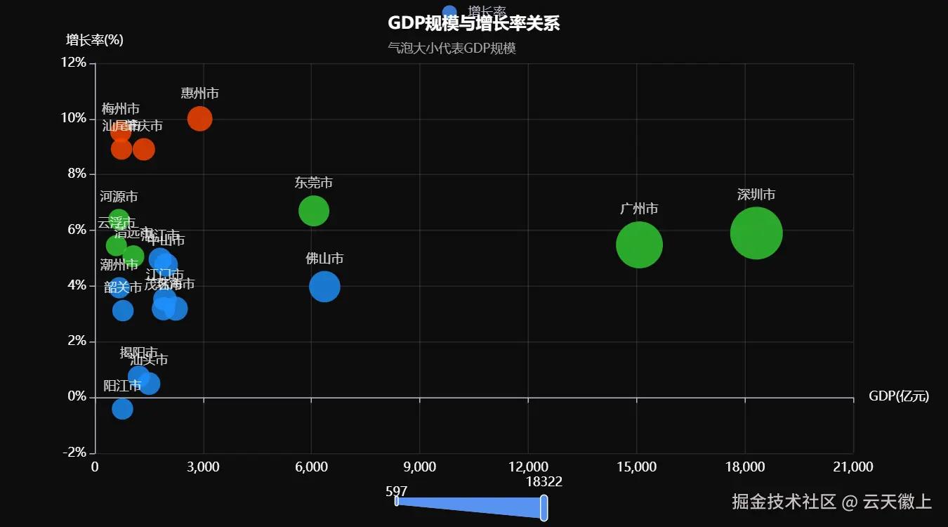 - 高增长城市规模中等:惠州市(2910.06亿元)和汕尾市(739.95亿元)等中等规模城市增长率较高。