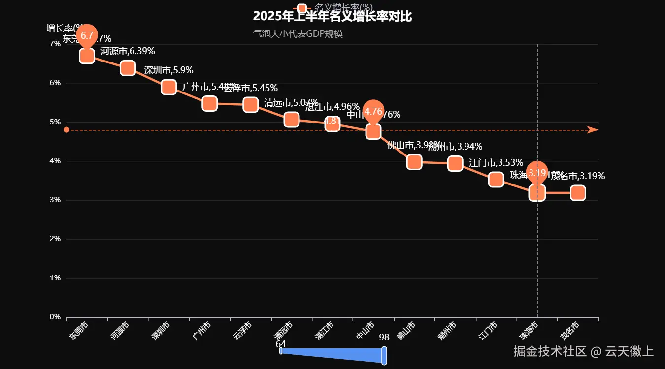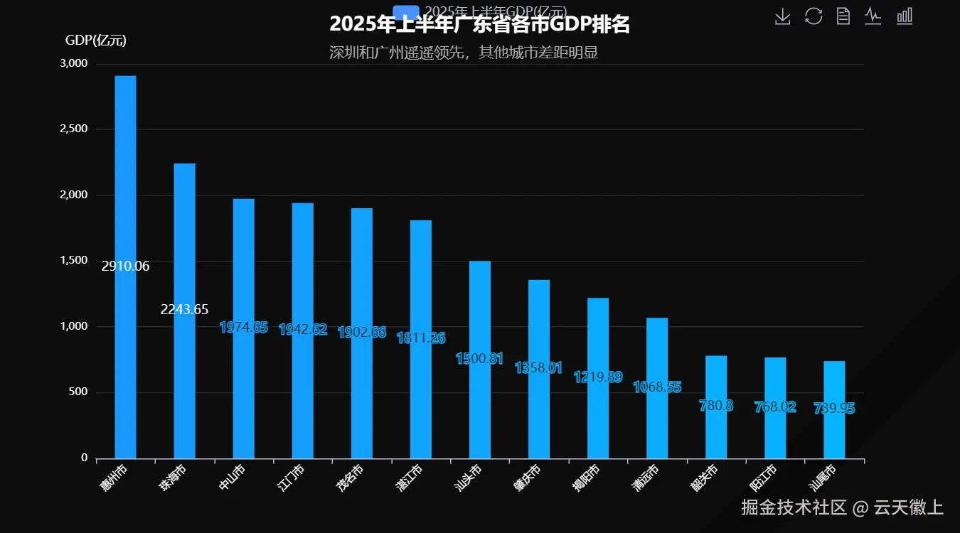 大家好!今天我将带大家深入分析2025年上半年广东省各市的GDP数据,并使用Python的pyecharts库进行炫酷的可视化展示。我们将从多个角度分析数据,并最终生成一个可移动的可视化大屏。
