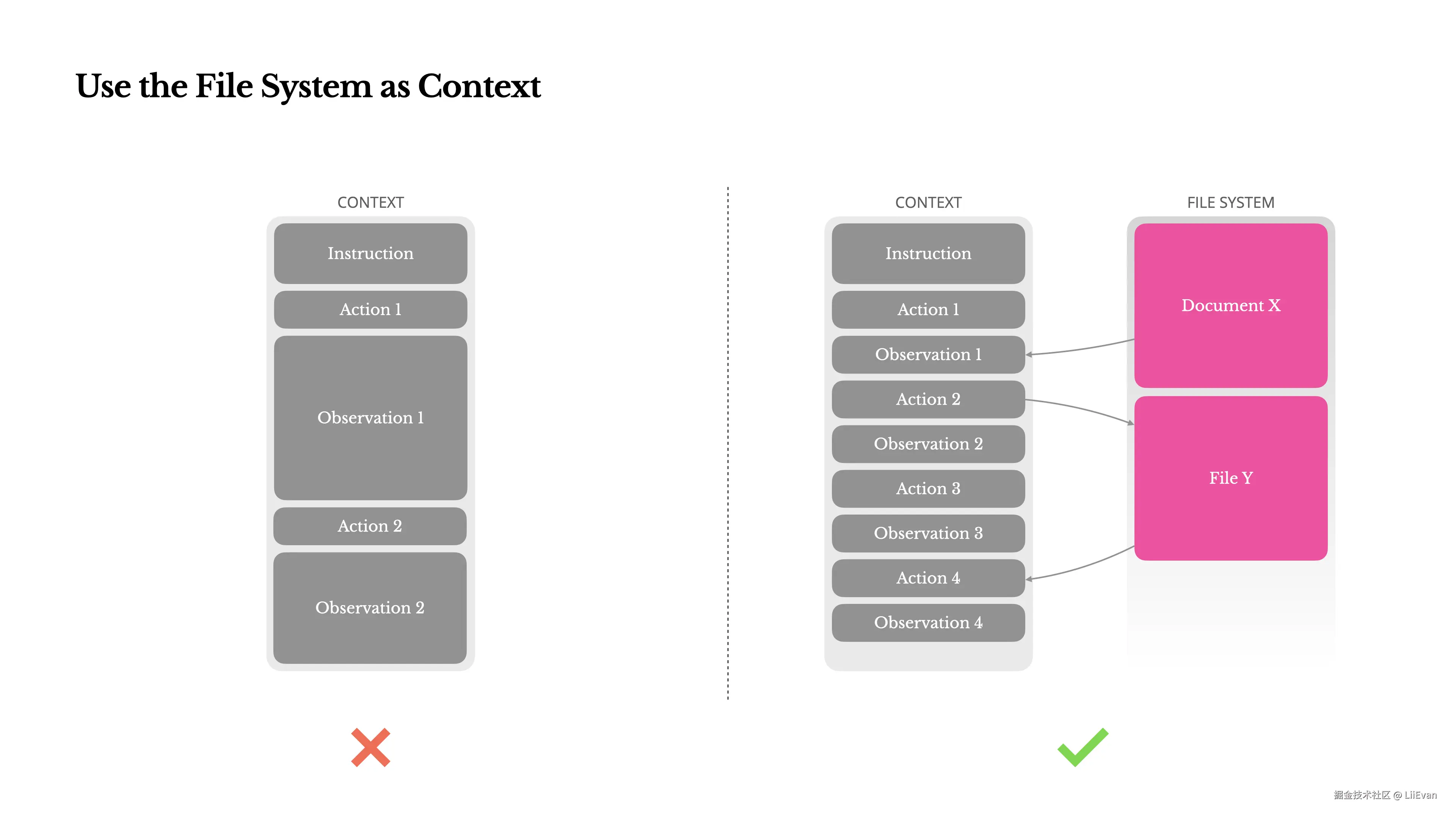 这就是为什么Manus将文件系统视为终极上下文:大小不受限制,天然持久化,并且代理可以直接操作。模型学会按需写入和读取文件——不仅将文件系统用作存储,还用作结构化的外部记忆。