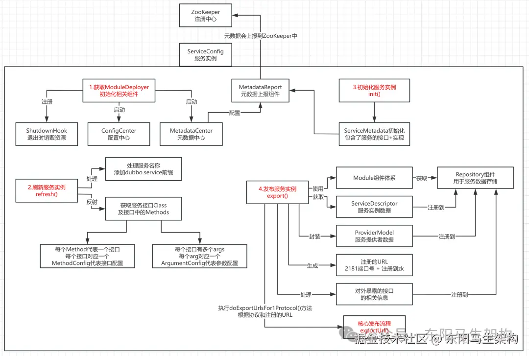 ServiceConfig的export()方法在进行服务发布时,首先会初始化相关组件,然后刷新服务实例,接着初始化服务实例,最后发布服务实例。