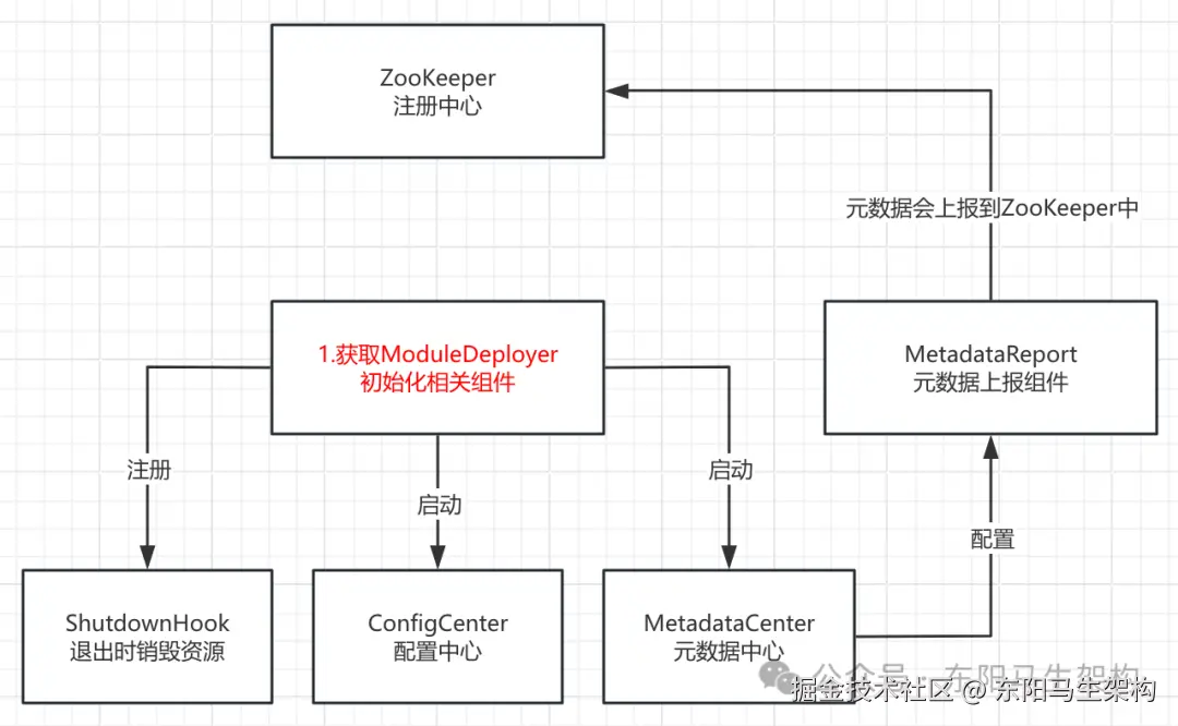 //Dubbo服务实例内部会有很多的代码组件,通过ModuleDeployer便可以避免零零散散的去调用和初始化