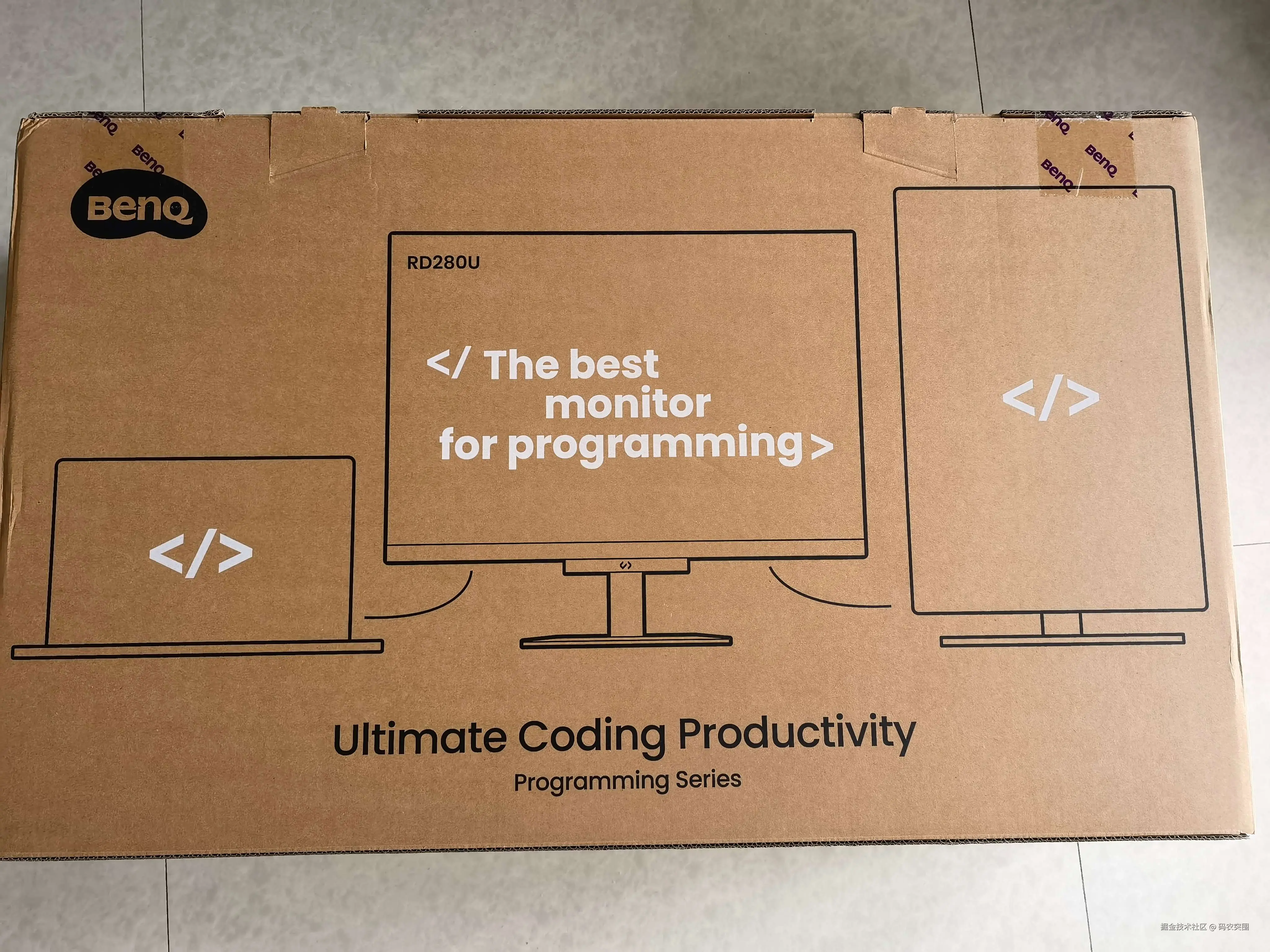 我向小A问了下这是个啥显示器,这么厉害,他告诉我是一个老牌明星公司明基(BENQ) 的产品,产品型号是RD280U,我因为也是一个老程序员,平时笔记本屏太小,还要经常在家写代码,于是也整了一个,刚好昨天到货了。