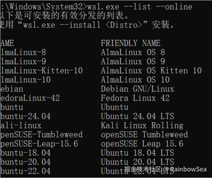 此时,通过执行如下指令查询可用的WSL分发列表(可能需要魔法上网才行)