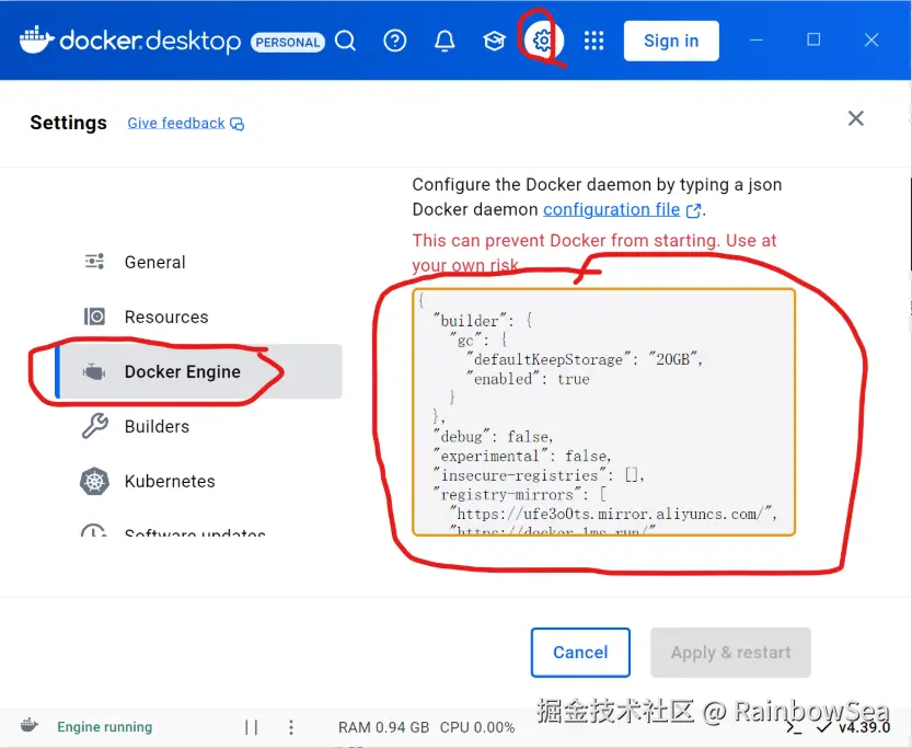 修改dokcer配置\ 打开安装好的docker的主界面:在设置界面找到Docker Engin,。