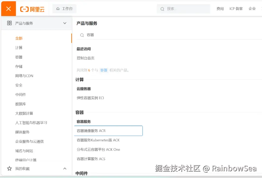 在产品与服务界面,输入容器,查询相应的服务,选择容器镜像服务ACR。