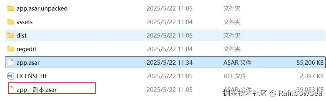 找到当前目录下的 app.asar 文件,并将其重命名为 app.asar.bak 或复制一份作为备份。
