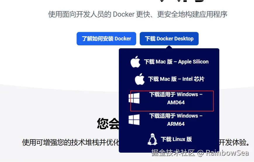 在docker desktop界面中选择合适的安装包的版本。显示如下: