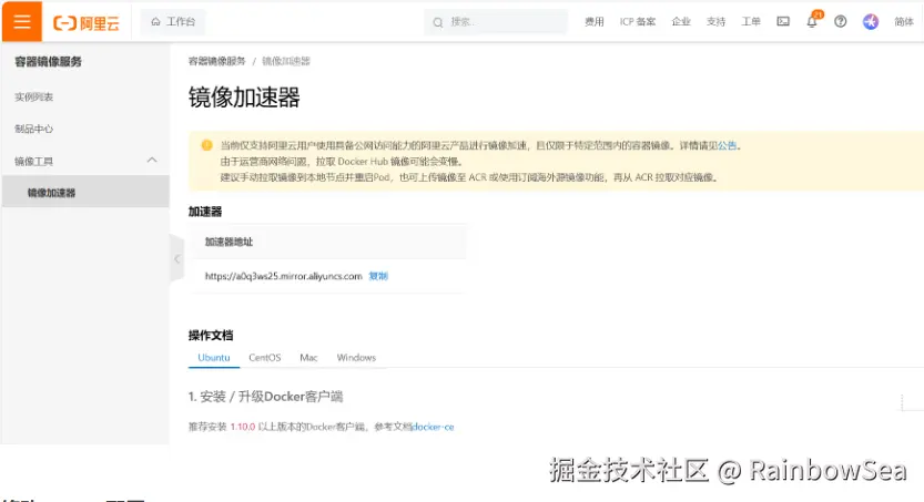 选择镜像服务\ 在容器和镜像控制界面中,选择镜像工具下的镜像加速器,即可获取个人专属的镜像加速器的地址,如下图所示。