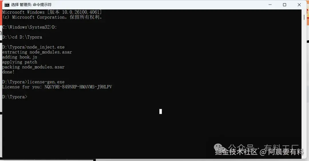 输入 cd D:\Typora 按回车,跳转到 Typora 安装路径