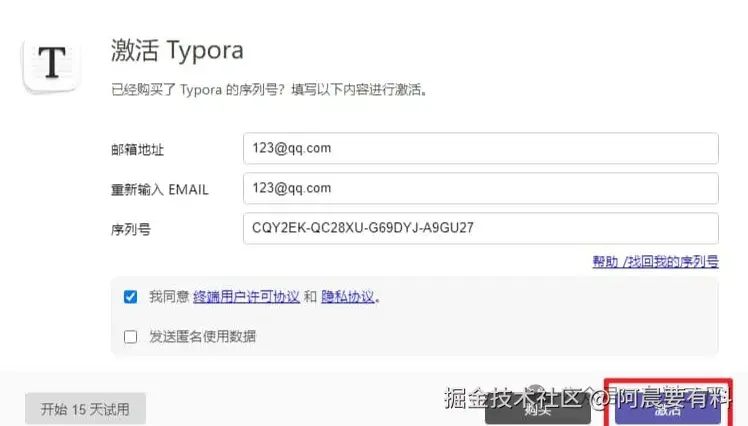 启动右键管理员身份 启动Typora,随意输入邮箱地址,并将生成的序列号粘贴到激活窗口中 取消匿名使用数据,点击激活按钮。
