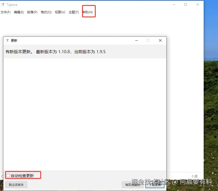安装完成后请勿更新 Typora,否则可能失效 可以点击帮助-》检查更新-》取消掉自动检查更新。如果需要更新,请先彻底卸载旧版本,再重新安装新版本。