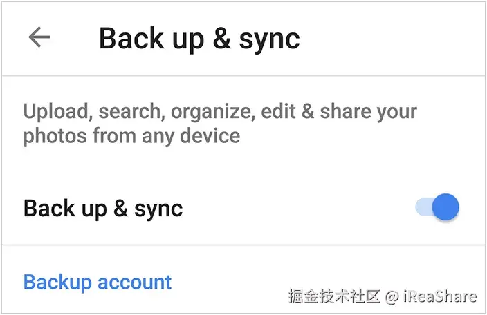 点击右上角的个人资料图标。前往“照片设置”>“备份和同步”。开启“备份和同步”功能。您的 iOS 照片将开始上传到 Google 相册(请确保您的 Wi-Fi 连接良好)。