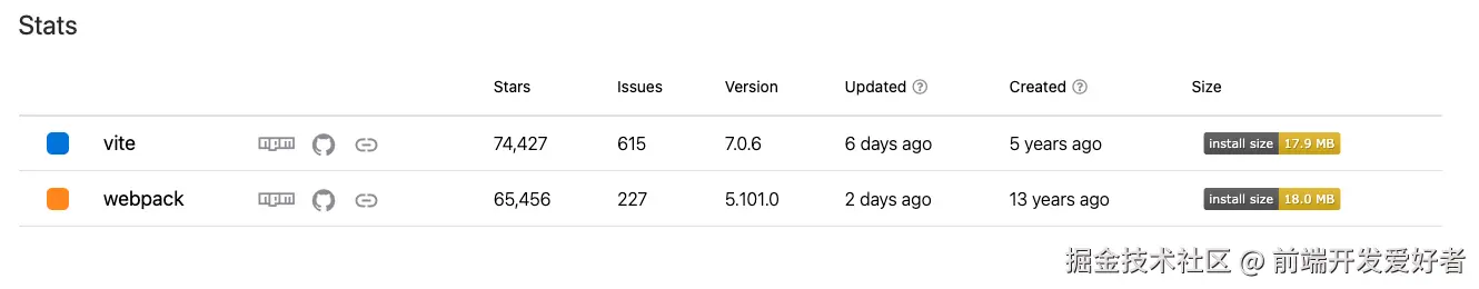 https://www.npmcharts.com/compare/Vite,vite,webpack?interval=7&log=true - npmtrends: