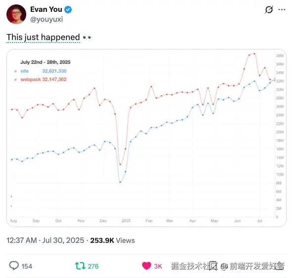 2025 年 7 月 30 日,尤雨溪推特晒出截图:Vite 周下载量首次超越 Webpack!