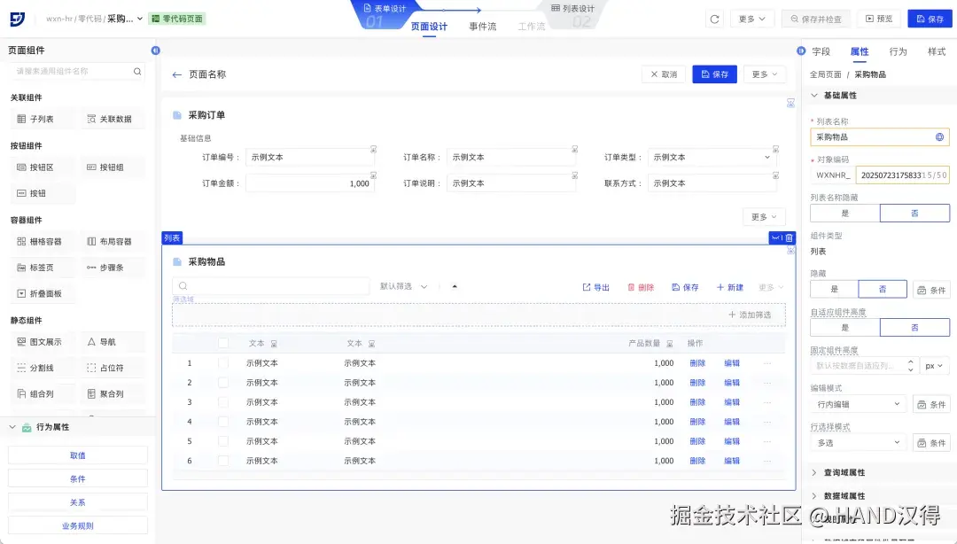 零代码组件还支持添加子列表,在低代码页面中两个业务对象之间如果存在头行关系,通常需要在关系配置弹窗中手动维护。但是在零代码中添加子列表后将会自动生成关系,实现头表单和行列表之间的数据联动。