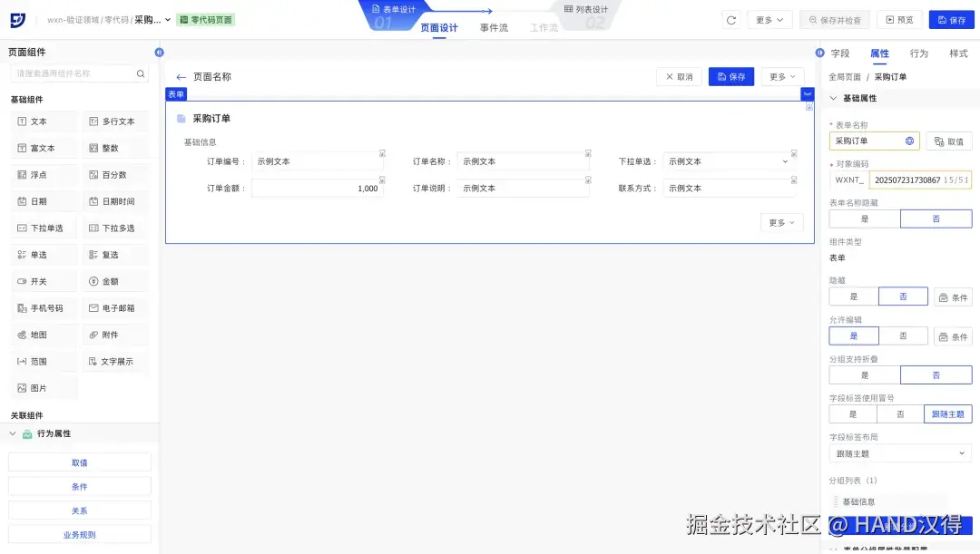 进入页面后零代码设计器和低代码设计器内的功能不同,调整了组件顺序,将更常用的基础组件放在上方。只需要根据实际业务需要的页面字段及样式,直接拖拽需要的基础组件到设计器中配置即可。