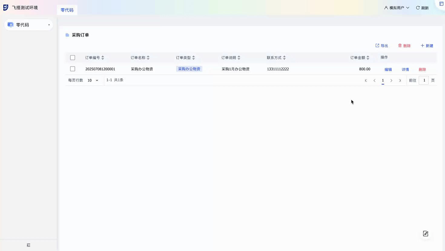 保存后预览页面,可以发现零代码页面不需要在业务对象中事先创建业务对象,不需要对列表进行过多配置,也不需要配置列表和表单之间的页面跳转,就可以实现一个常见的信息维护的功能。没有任何代码基础的业务人员也能完成功能搭建。
