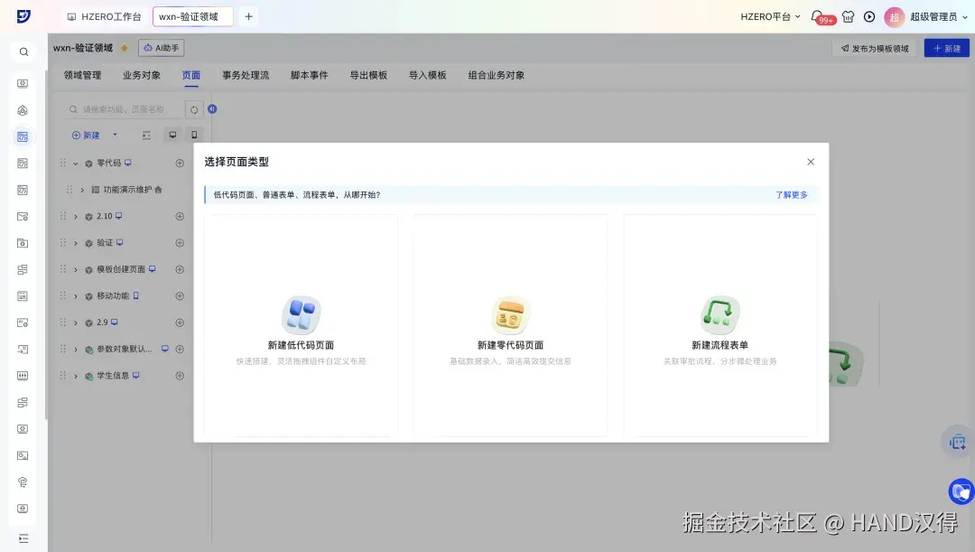 在飞搭页面中进入领域页面后可以在创建页面时选择页面类型。