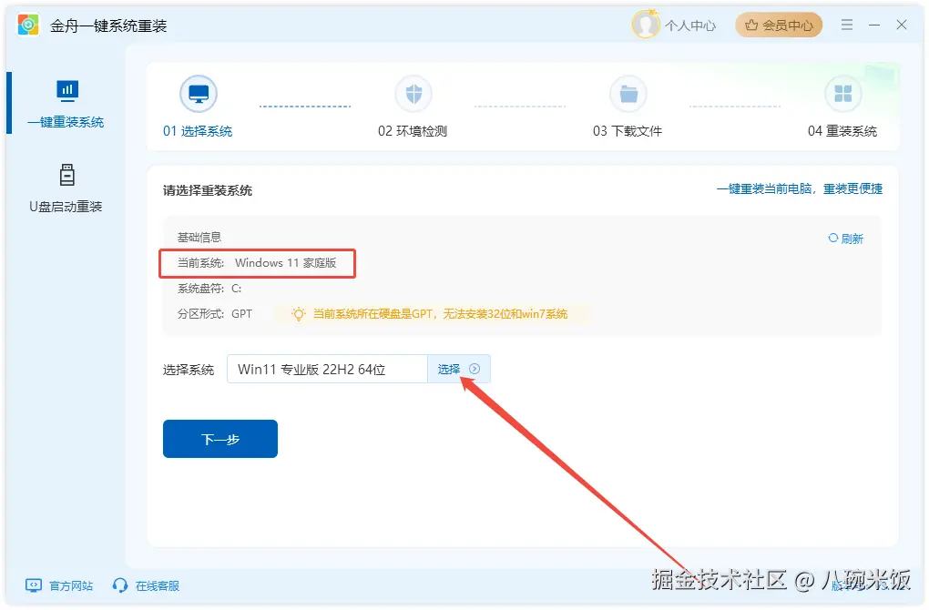 Step1、Windows电脑运行【金舟一键系统重装】软件,点击【选择】