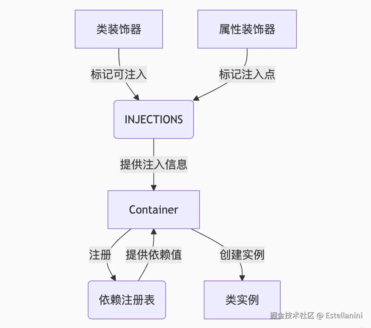 @injectable标记类(在装饰器执行时,将该类需要注入的属性信息存入INJECTIONS)。 -