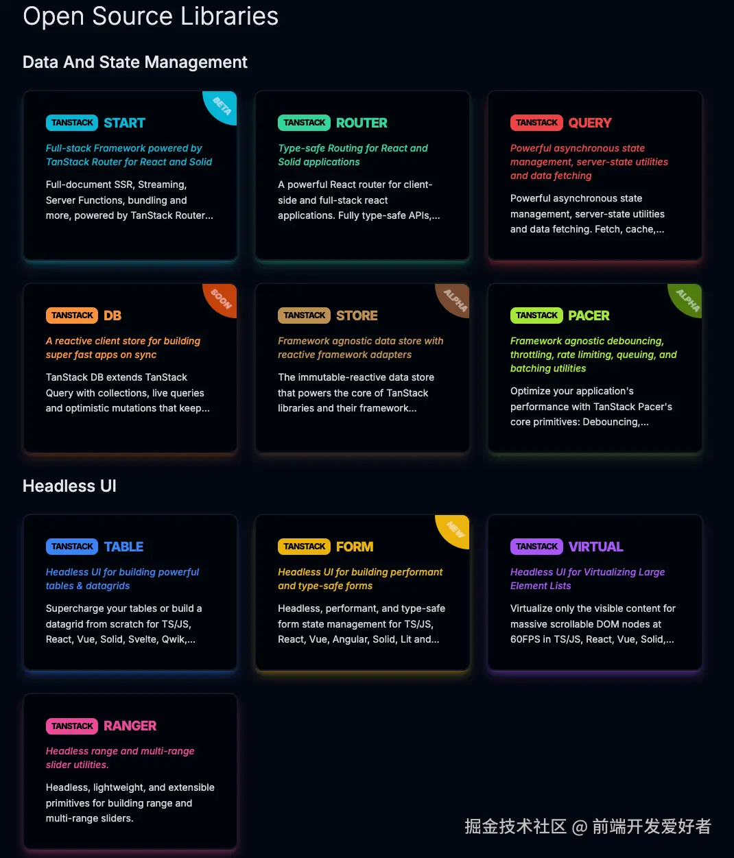 TanStack 是一组「无头(Headless)+ 类型安全 + 跨框架」的微型库集合。
