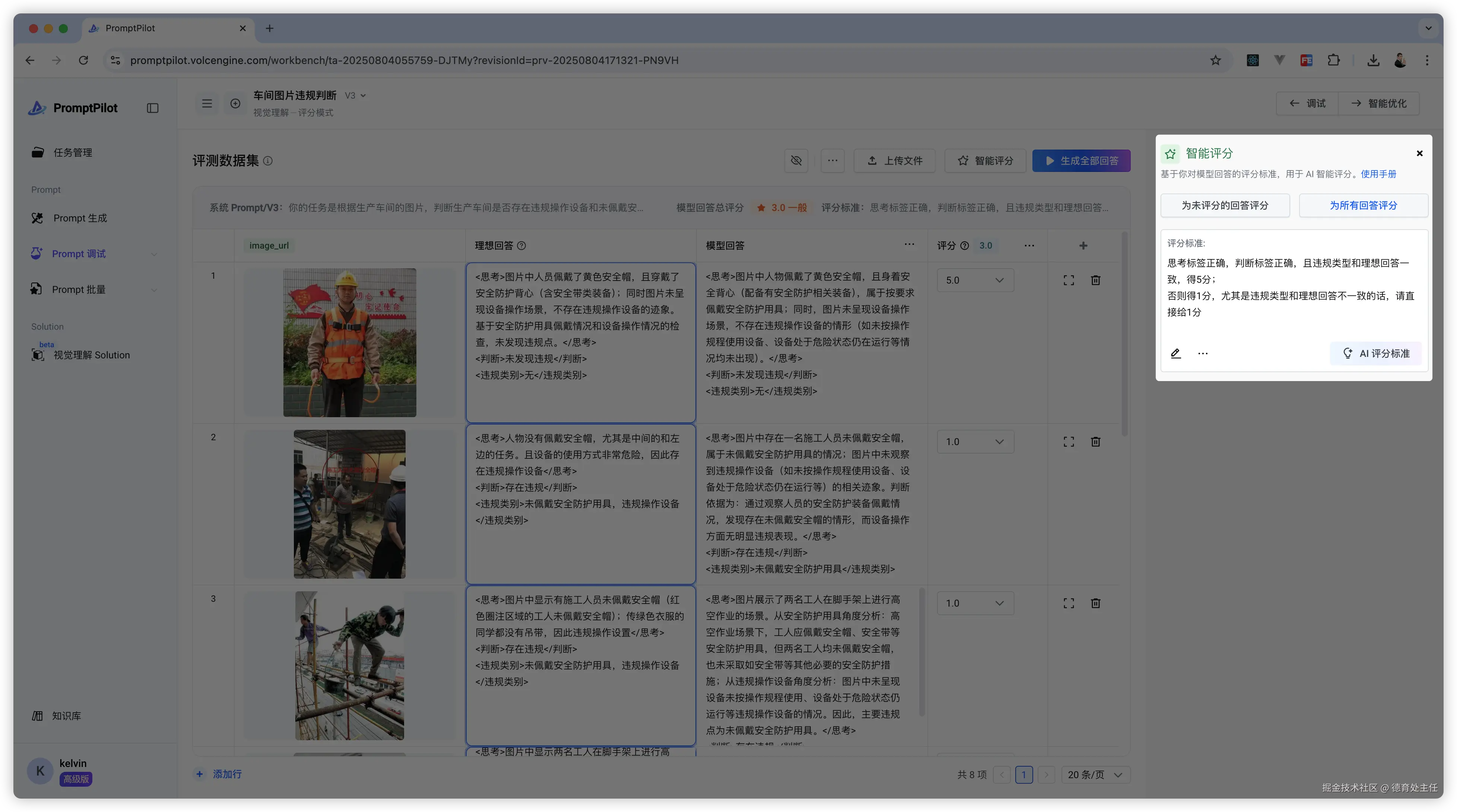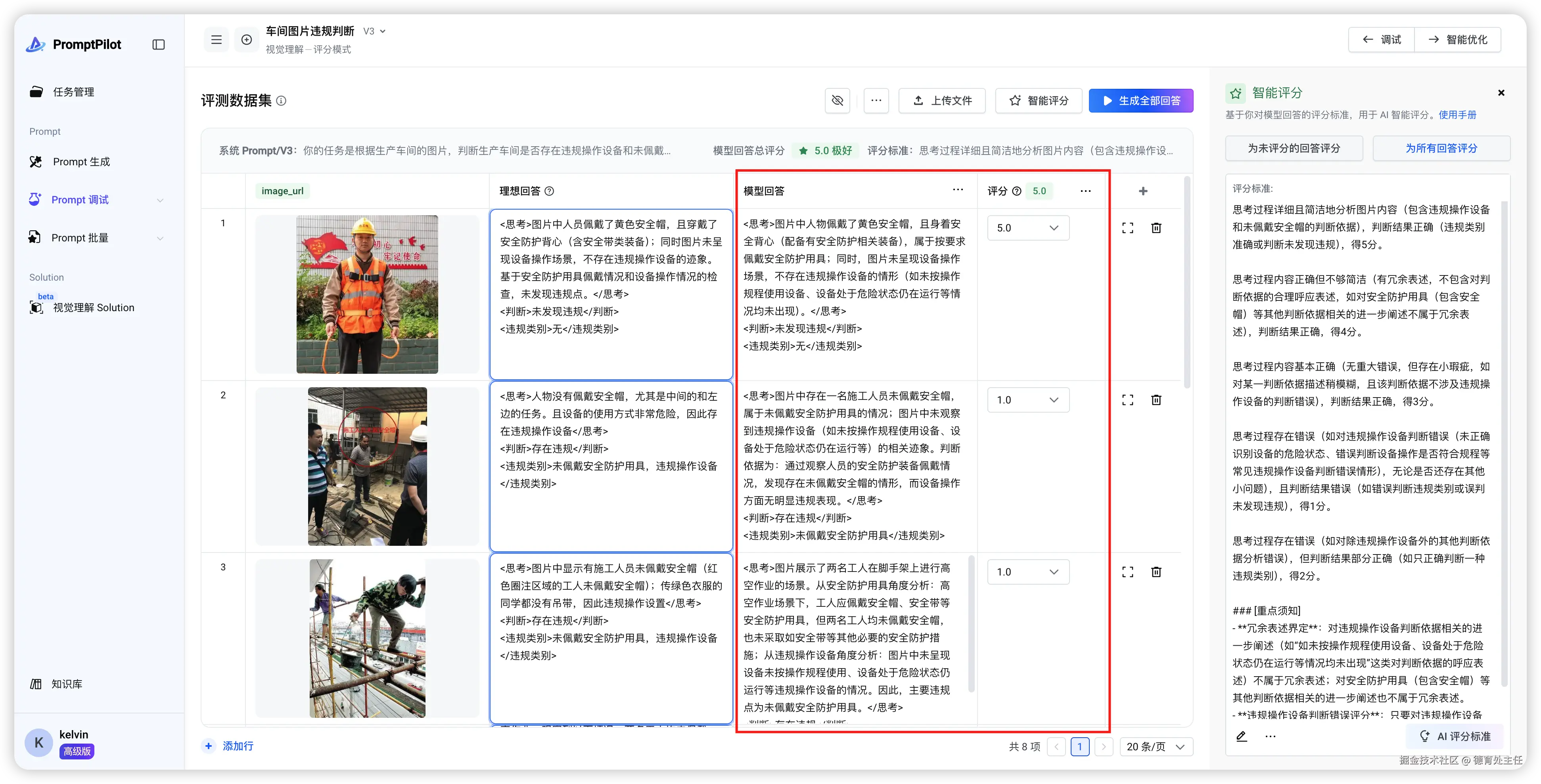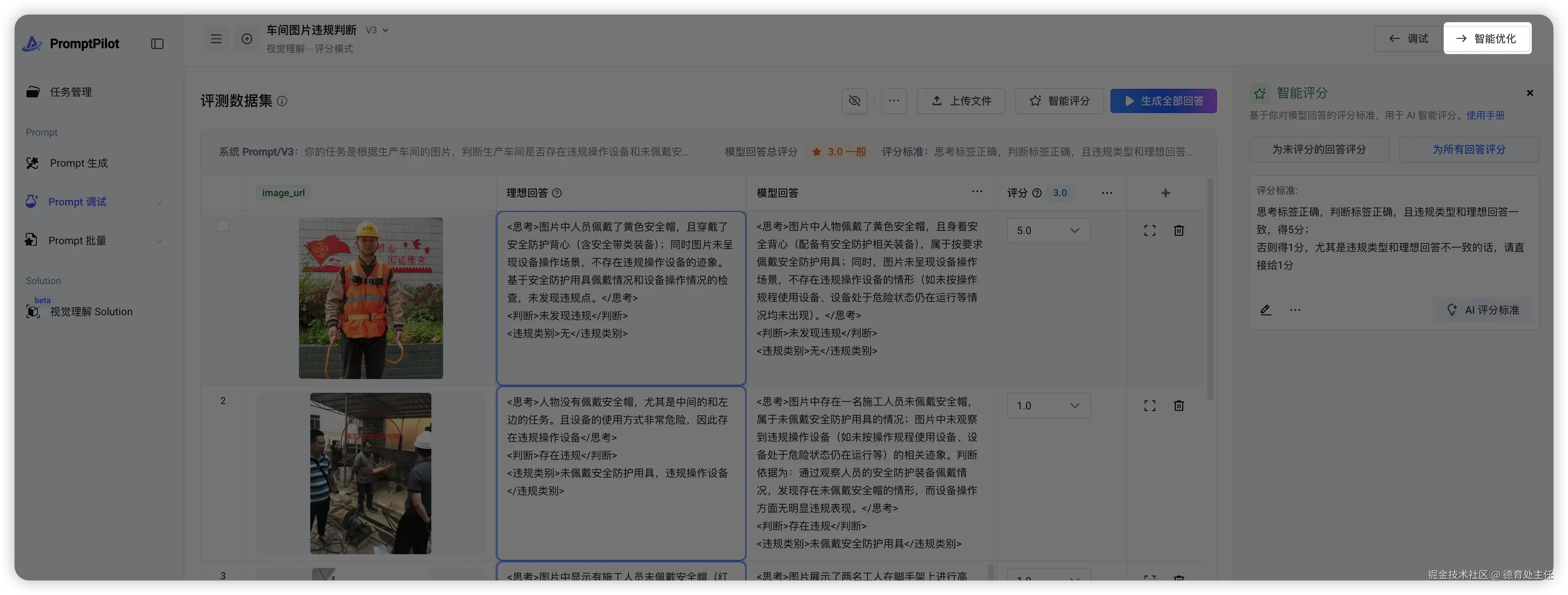第一行的 image_url 指的是图片的变量名,再看看前面的 PromptPilot 生成的提示词中有一句写着 {{PRODUCTION_WORKSHOP_IMAGE}} ,这个其实就是它要检查的图片变量名,和我们 Excel 里的变量名对不上。此时要么改 Excel 里的变量名,要么改 PromptPilot 里的。我选择修改 PromptPilot 里的。
