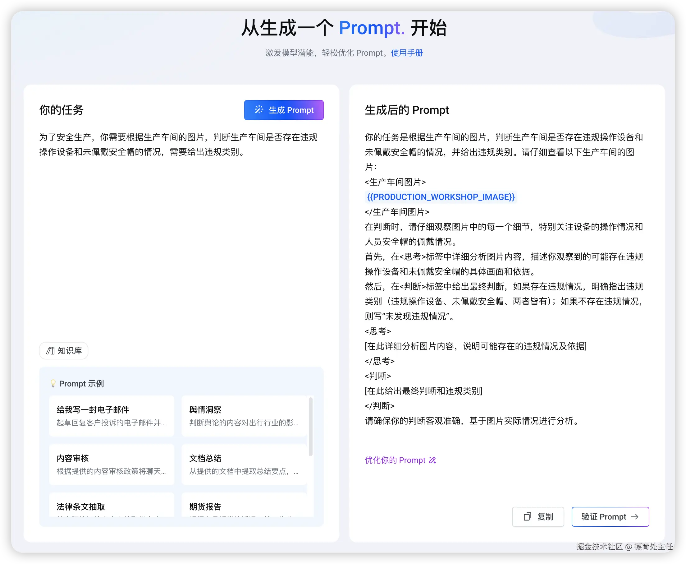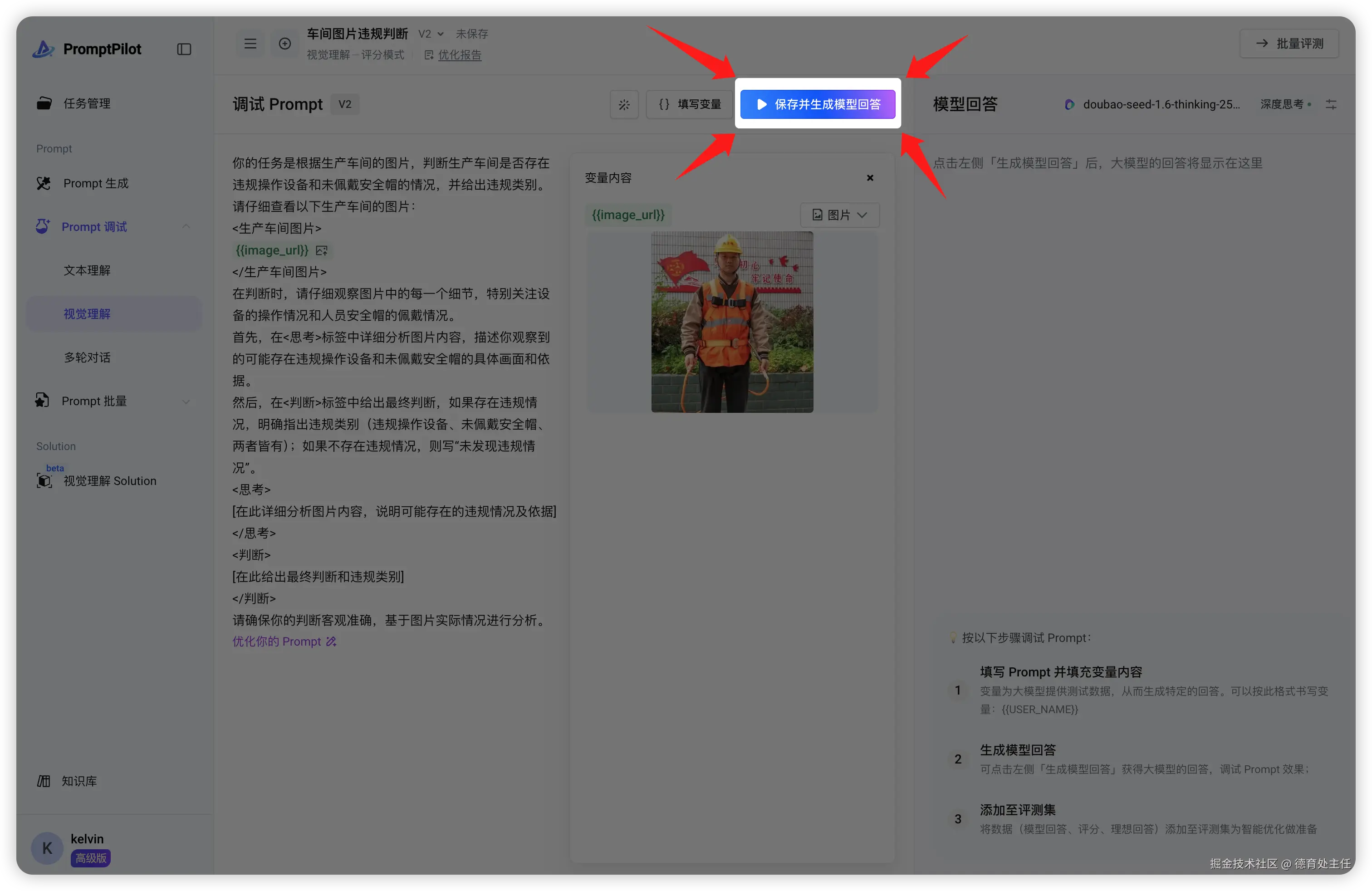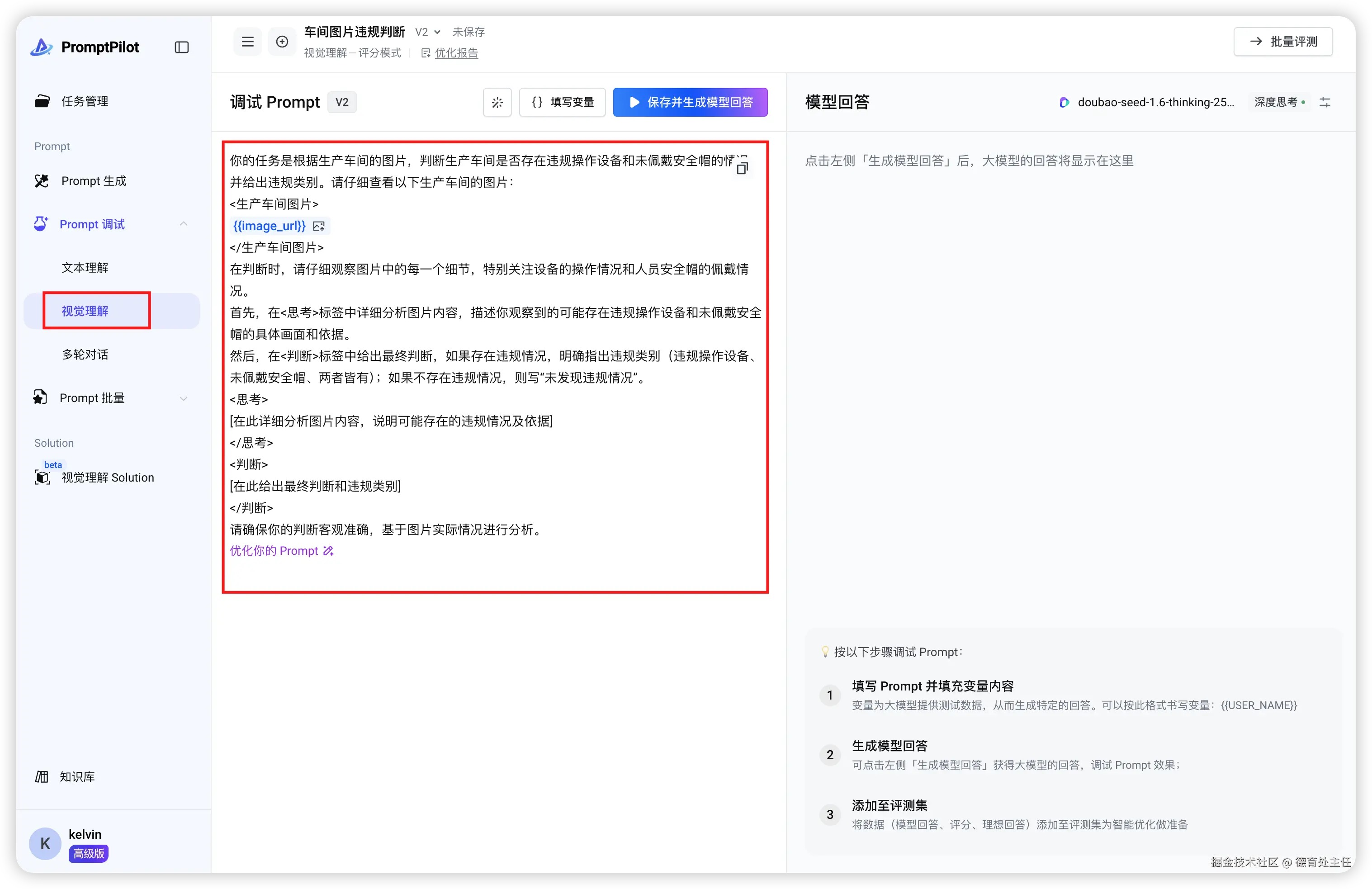 把这段提示词复制出来验证一下。切换到“Prompt调试 -> 视觉理解”,将刚刚生成的提示词复制进来。