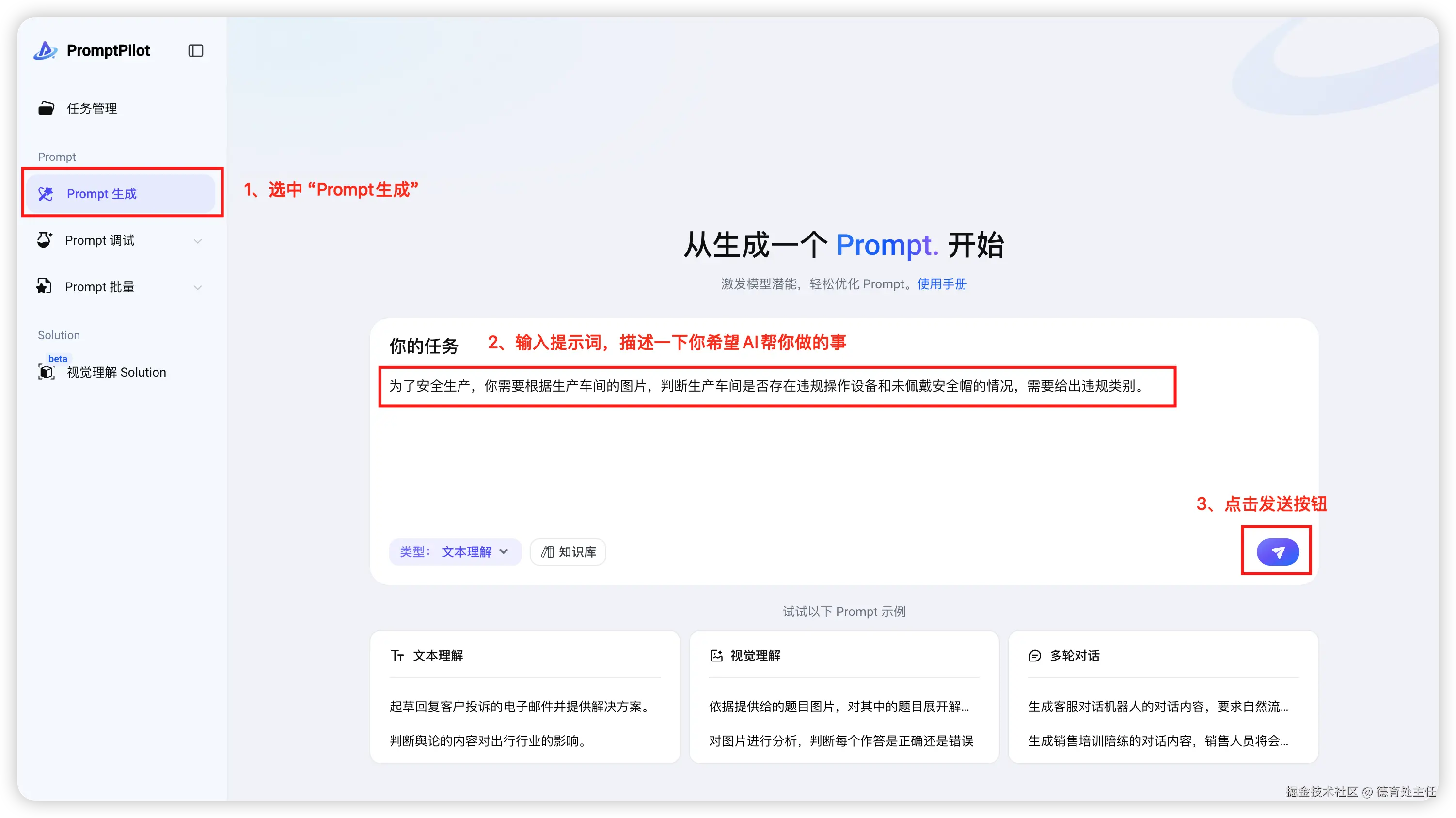 登录后,选中“Prompt生成”这个菜单项,然后输入你希望AI帮你完成的任务,最后点击输入框右下角的发送按钮。