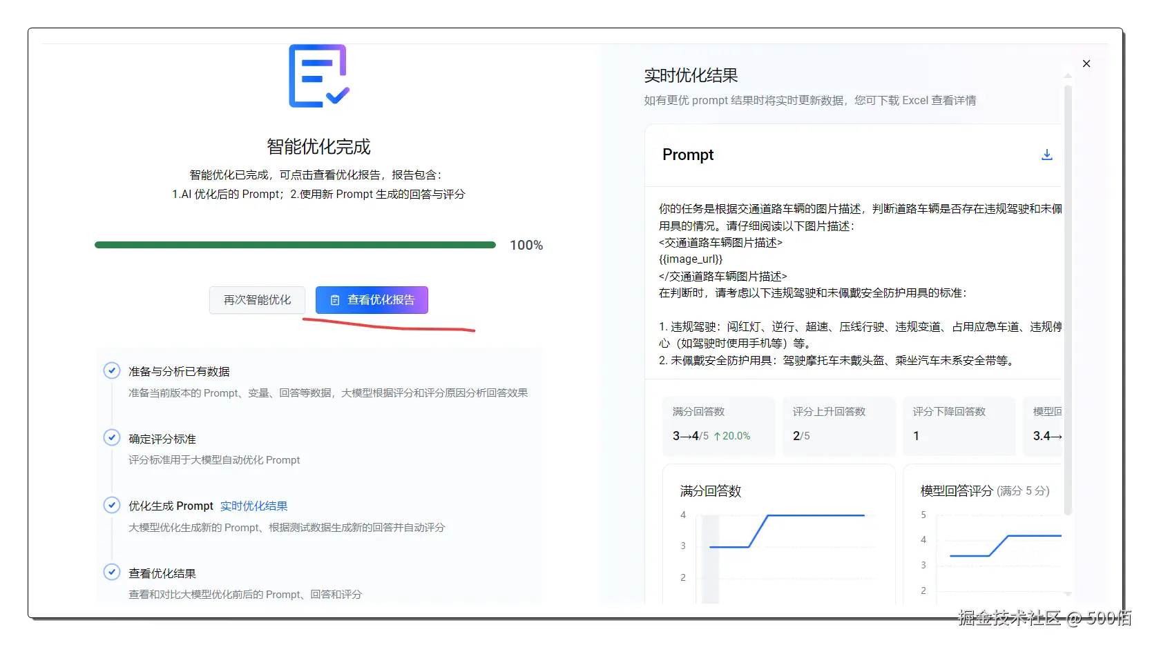 因为最终的分数符合我的预期,4分,换算到百分制,其实是80分,所以可以正常结束。 但是如果不满意,想继续优化,可以点如下按钮,继续优化下一轮,通过更多的迭代轮数提高效果。