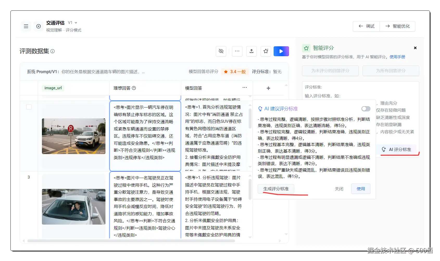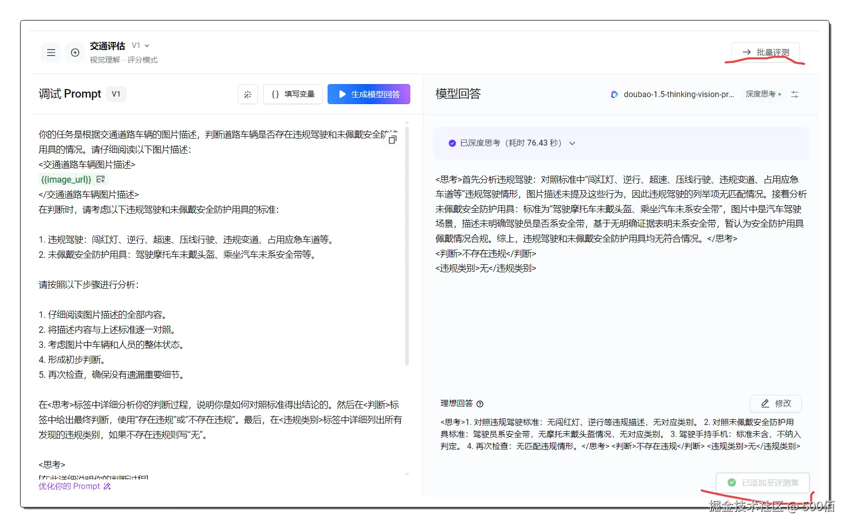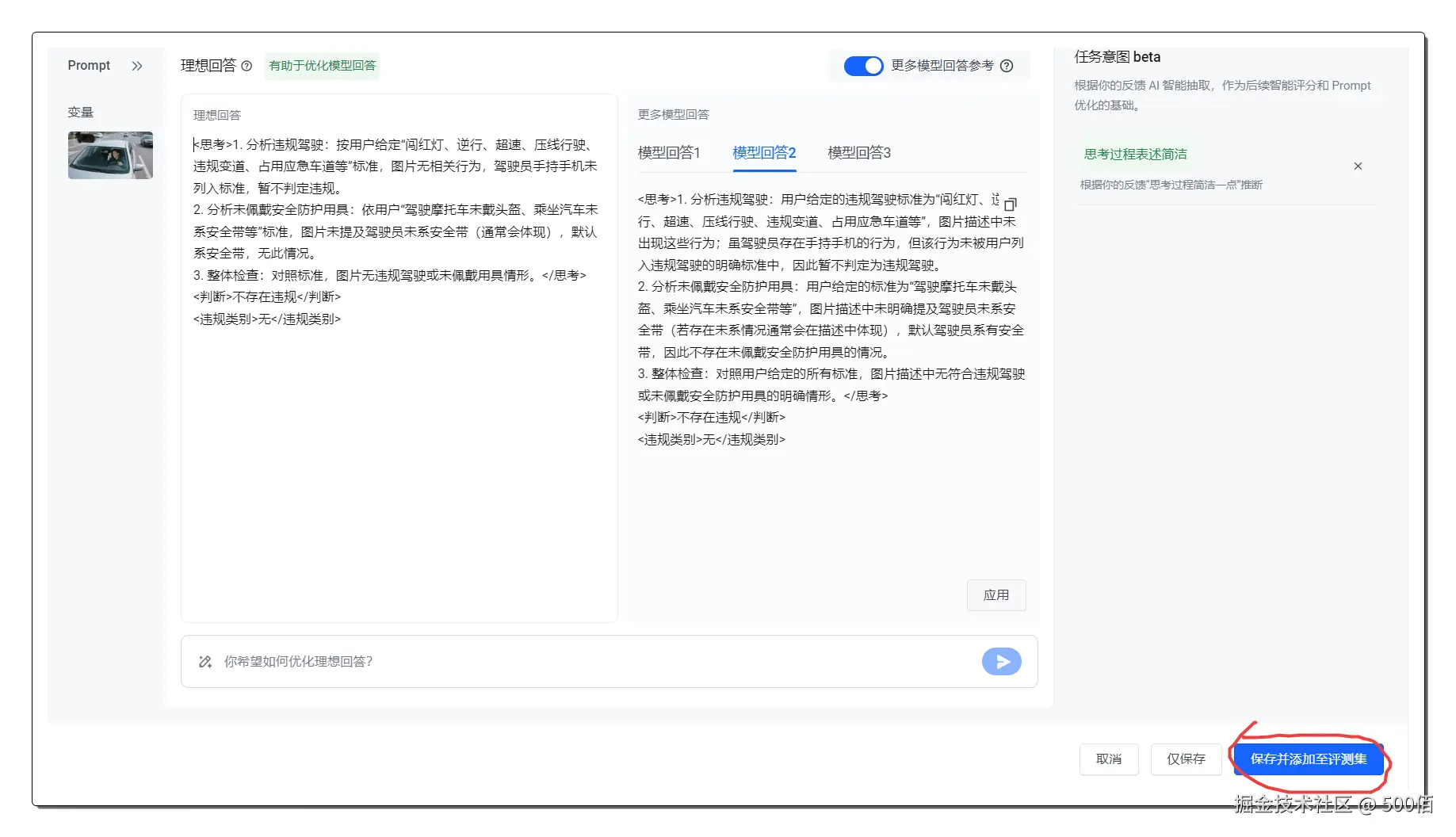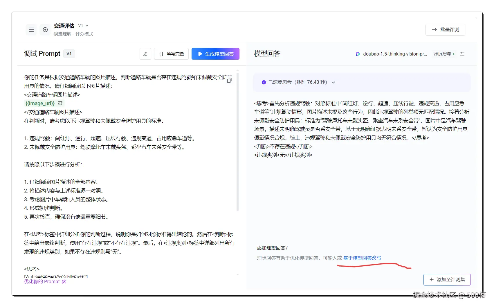 简单来说,就是让AI像一个经验丰富的安全检查员一样,不仅能看懂图片内容,还能根据既定的规则和标准,判断图片中的人物行为是否合规。然后根据豆包新模型的回答,我们可自定义一个评分标准,让大模型感知它的回答满意度,最终优化出一套非常清晰的提示词。