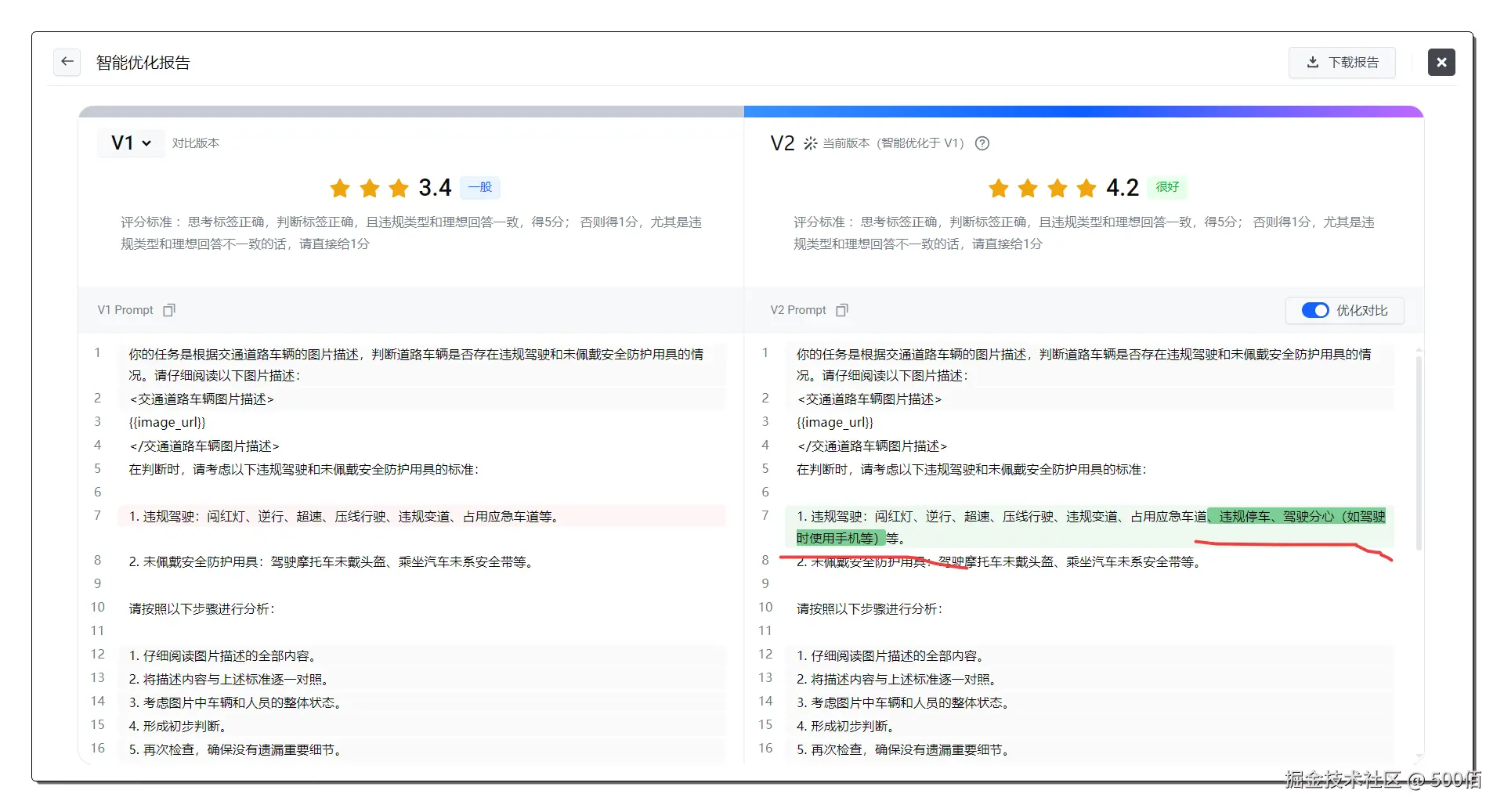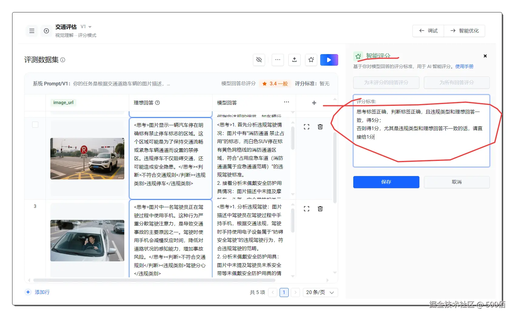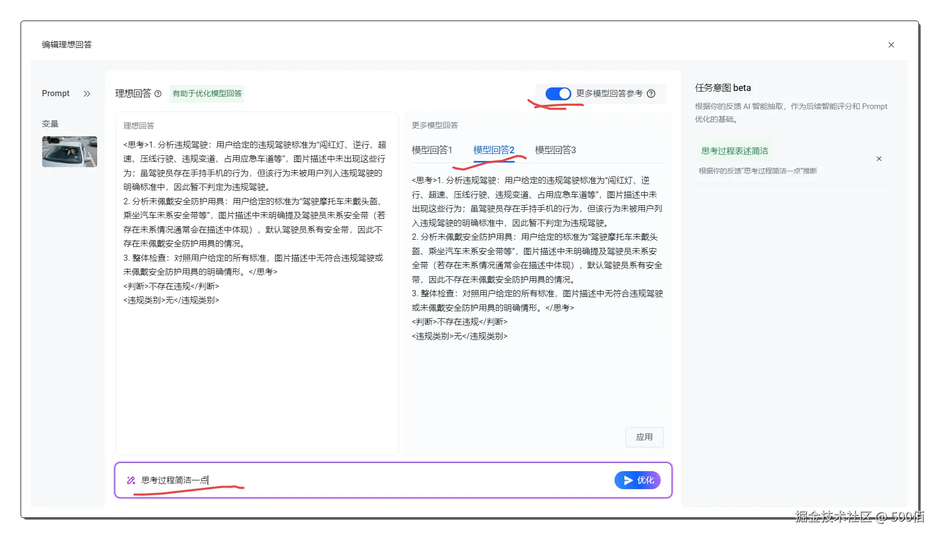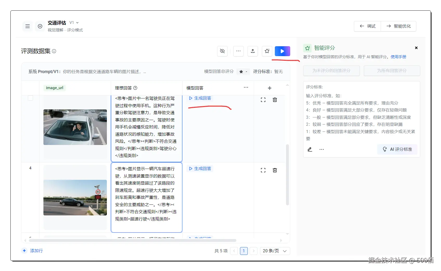 简单来说,就是让AI像一个经验丰富的安全检查员一样,不仅能看懂图片内容,还能根据既定的规则和标准,判断图片中的人物行为是否合规。然后根据豆包新模型的回答,我们可自定义一个评分标准,让大模型感知它的回答满意度,最终优化出一套非常清晰的提示词。
