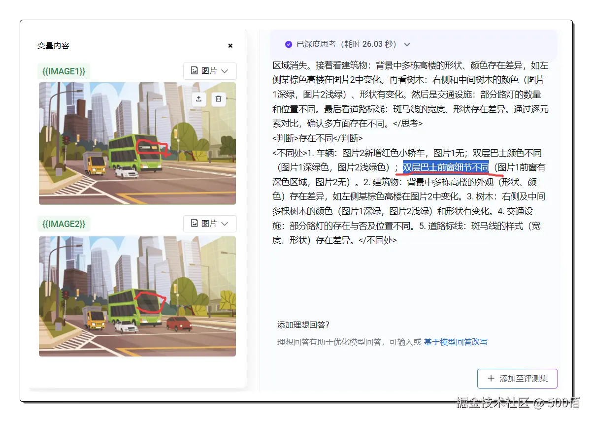 先用一个找不同的小游戏,进行细节测评,PromptPilot 直观视觉审查能力、细节敏锐度可平替Claude-4.0-Sonnet的推理能力。