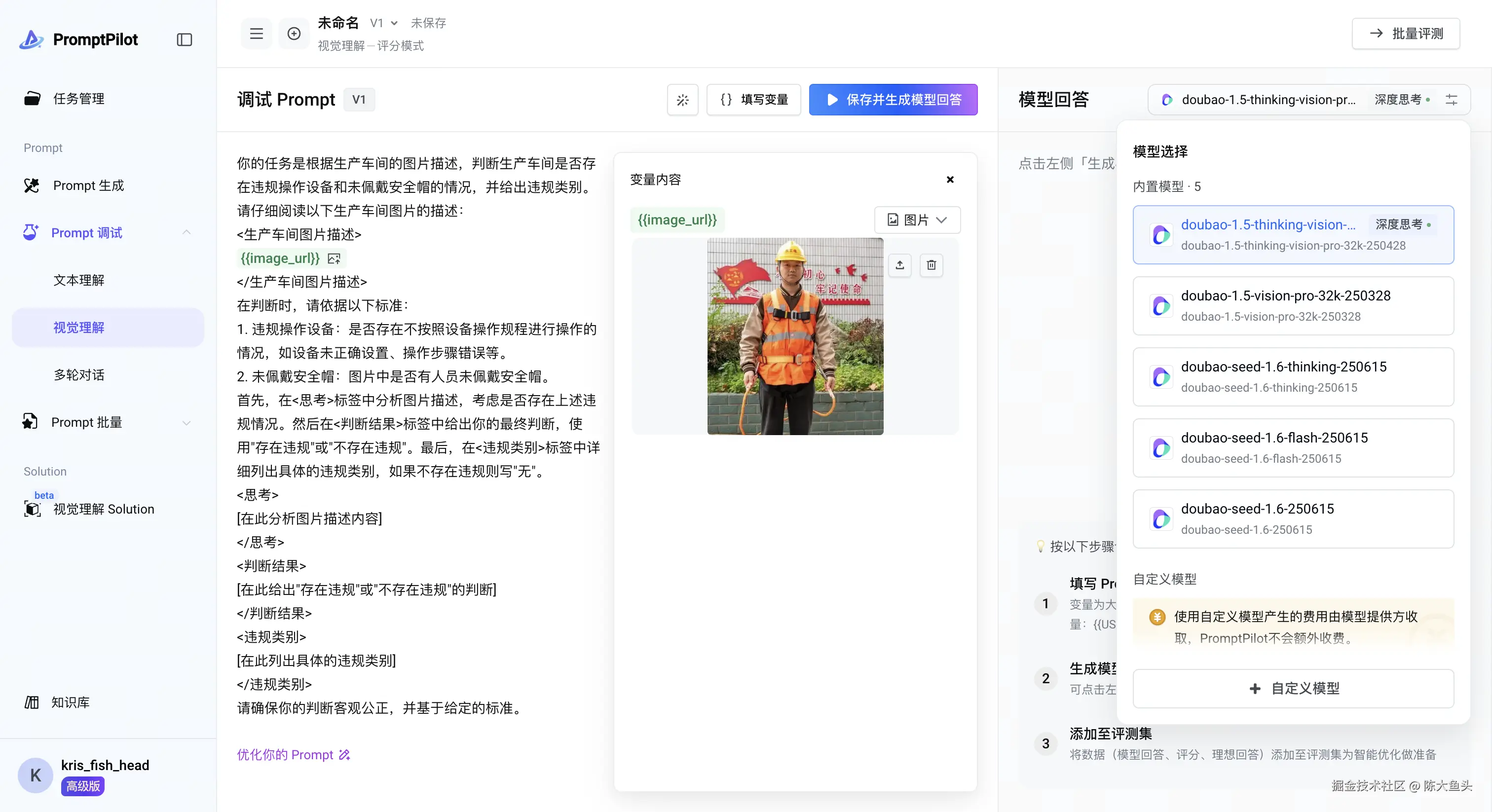 然后我们选带 thinking 的模型,这里我选 doubao-1.5-thinking-vision-pro-32k-250428