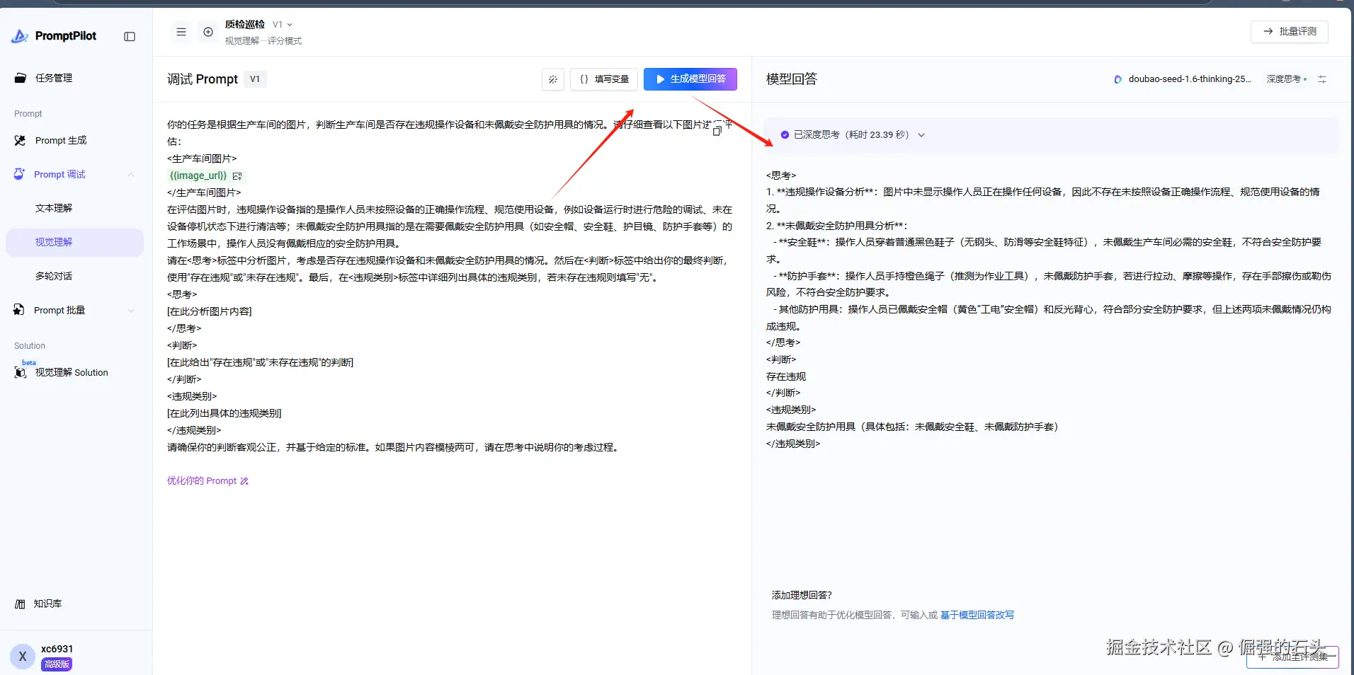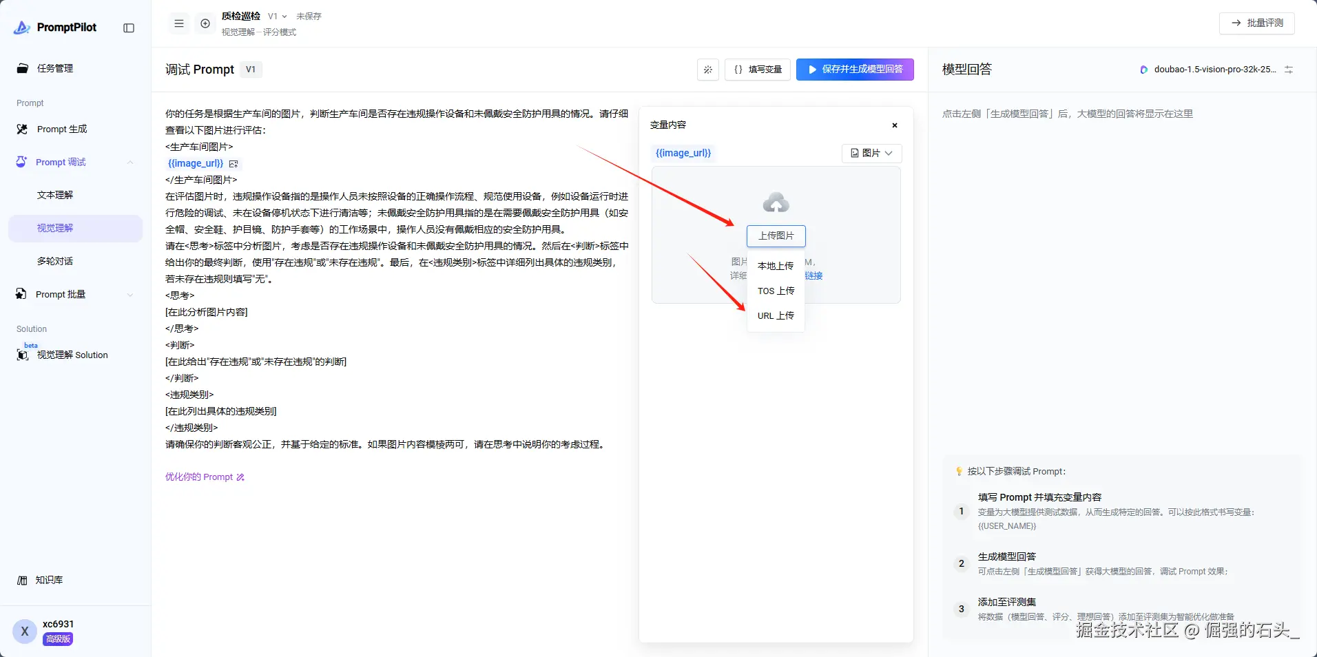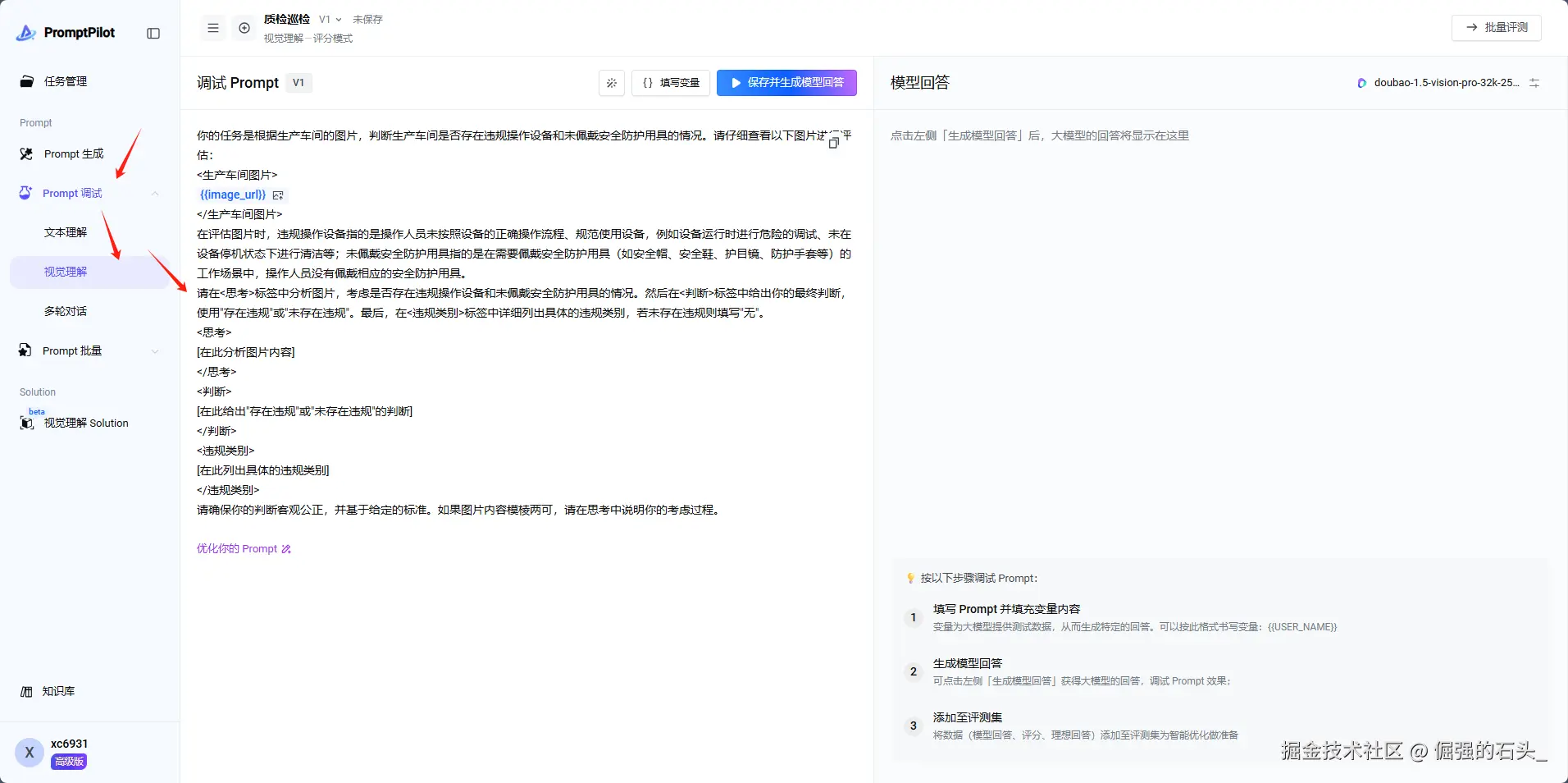 按照下图步骤,点击Prompt调试——视觉理解,将刚刚生成的Prompt复制过去