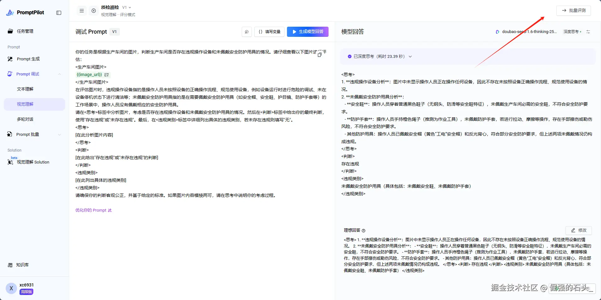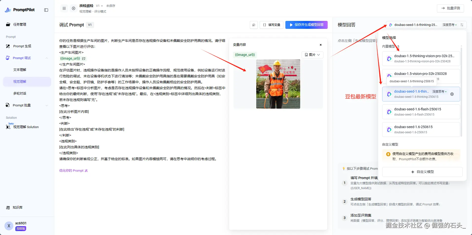 接下来,我将以通过一个质检巡检--图片理解任务为例,来深度解析如何通过PromptPilot实现提示词的精准优化达到自己满意的效果 PromptPilot独立站地址👉promptpilot.volcengine.com/startup
