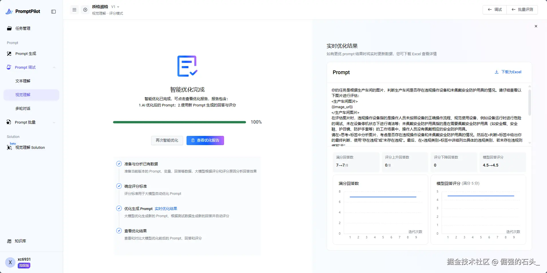 优化完成之后,右侧生成最终版的Prompt,如果对结果满意可以直接使用 如果对结果不满意,可以查看优化报告,优化评分和评分标准,重新进行智能优化,通过反复迭代,得到自己满意的提示词