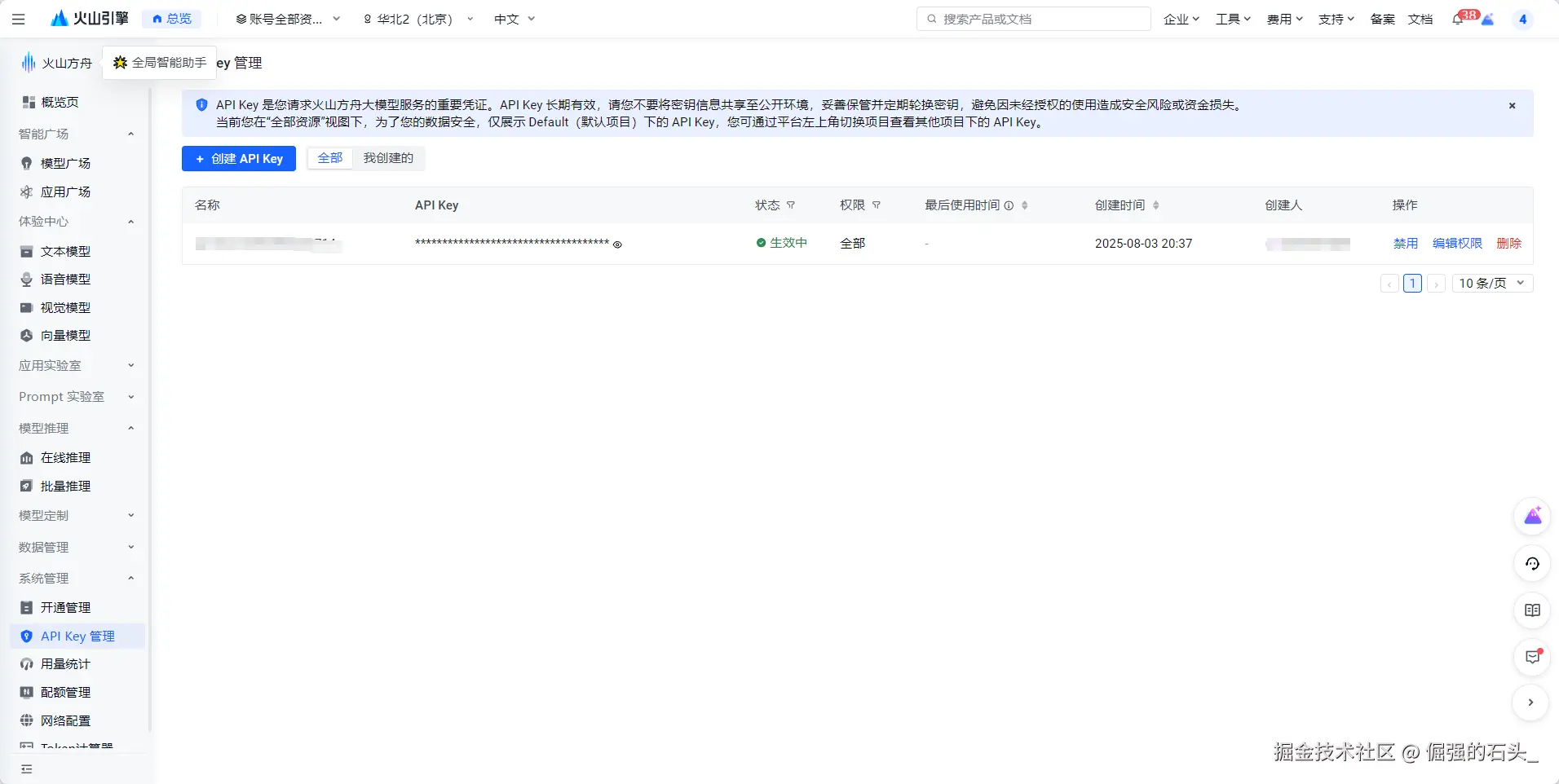 - 访问方舟控制台-API Key 管理创建 API Key,获取API key