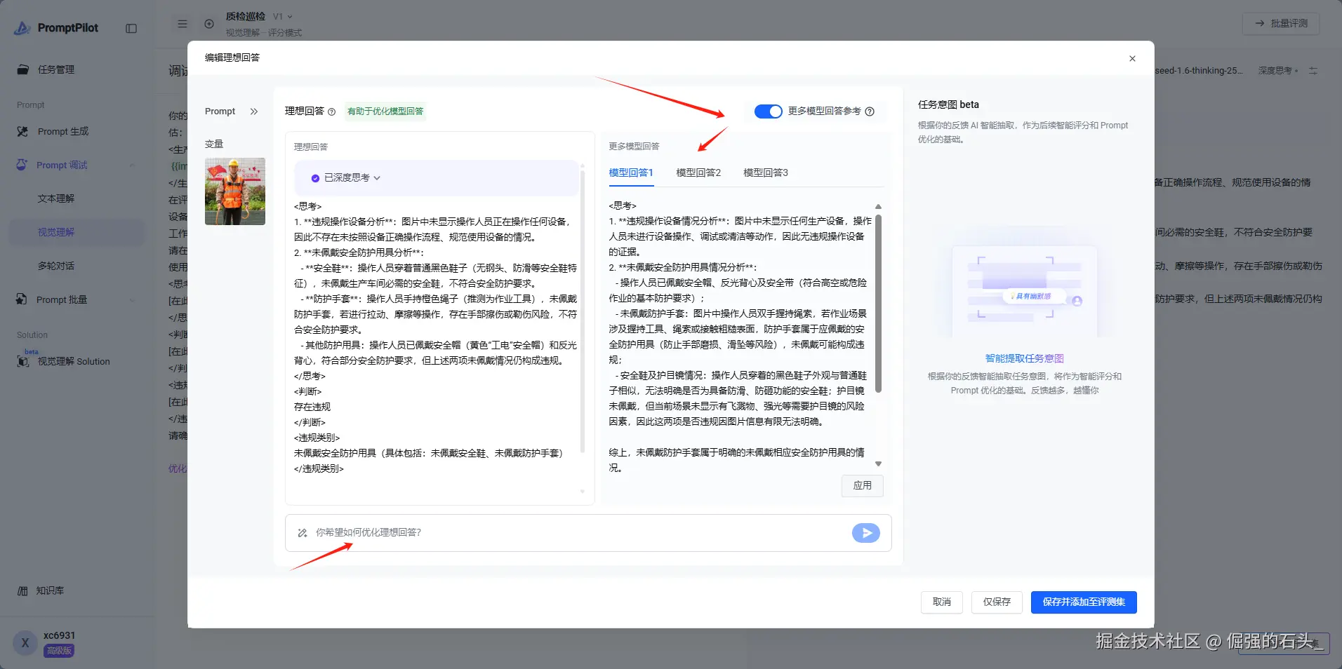 点开之后可以选择多个模型回答 并且在下方的文本输入框对模型提出优化建议,另外,如果你对结果有理想问答,可以直接输入的右侧文本框内,这样模型可以更好的理解你的意图