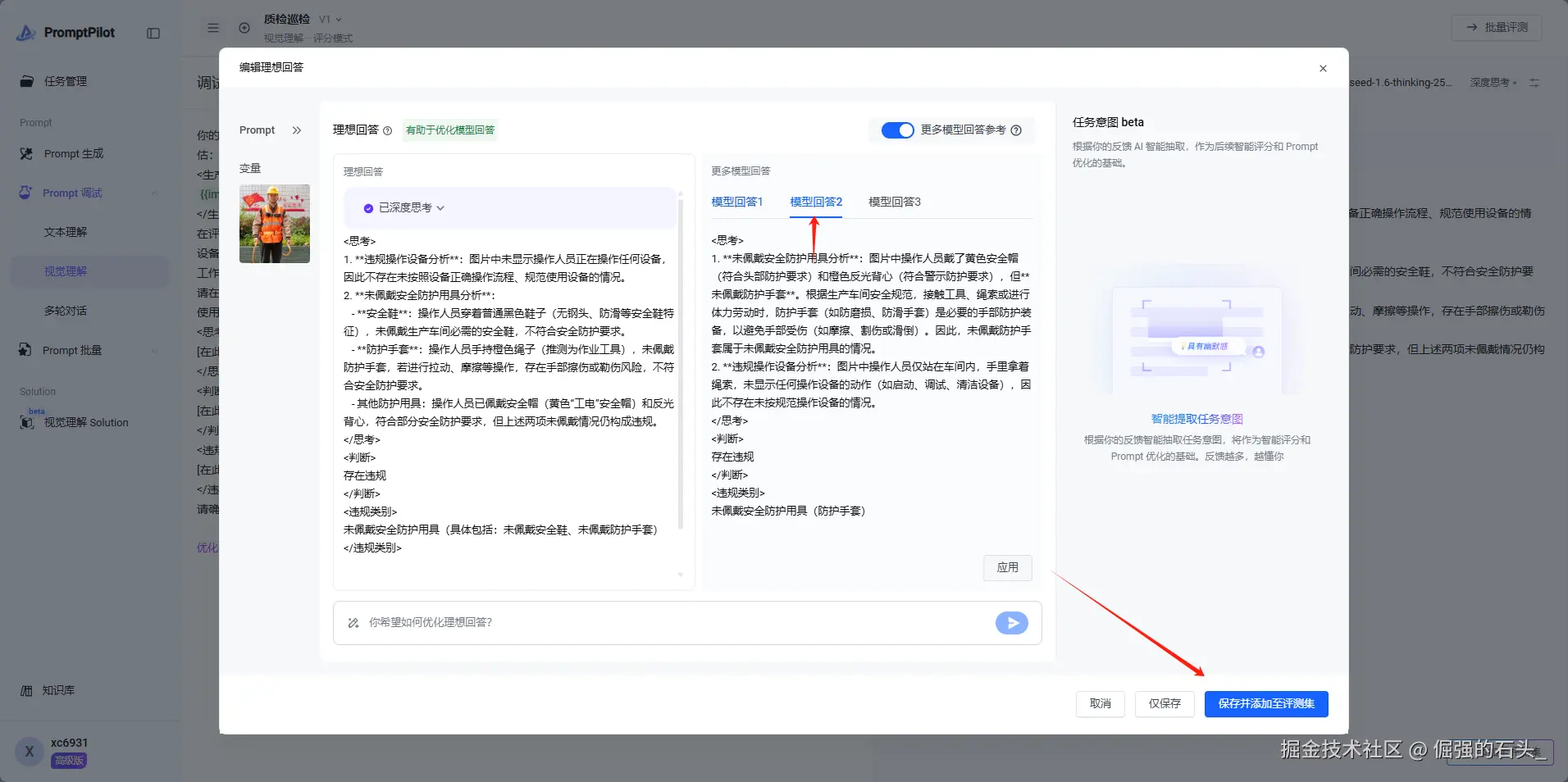 我这里选择的模型2,因为明显图中工作人员,佩戴了安全帽和安全背心,只是没有带安全防护手套,也不存在安全鞋的问题,然后点击下方保存到测评集