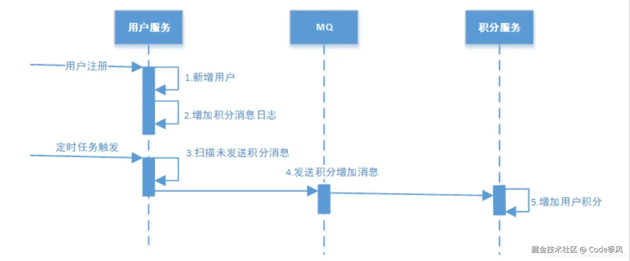 - 写业务 + 写消息:用户服务在同一本地事务里,完成 “新增用户” 和 “记录积分消息日志”。
