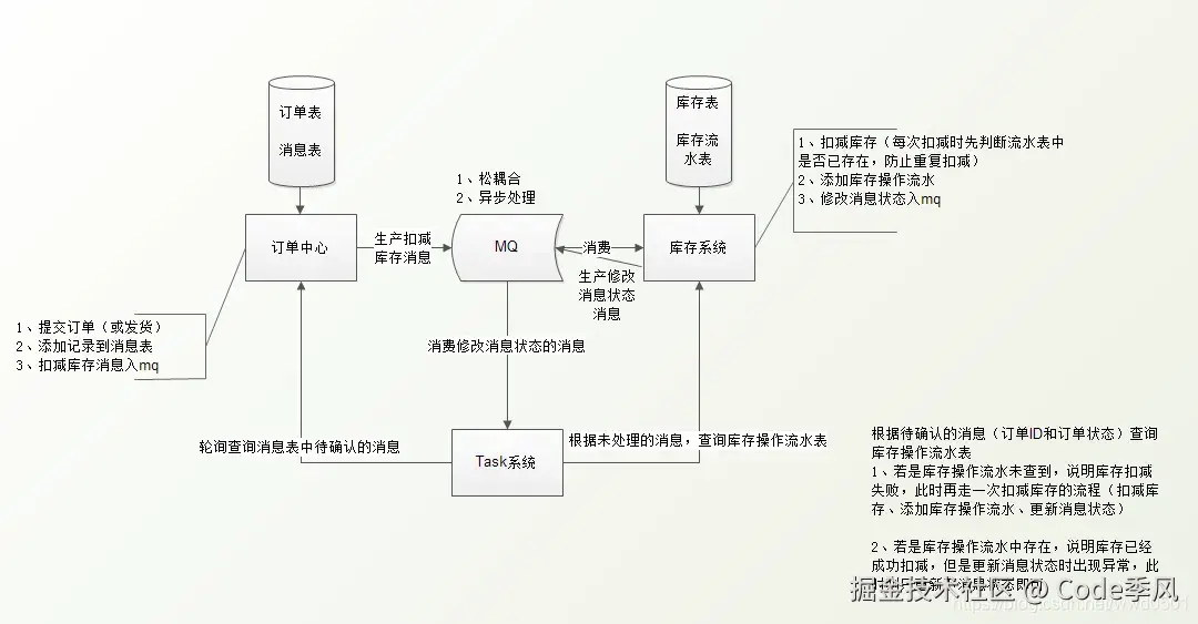 - MQ 异步处理:库存系统消费消息,执行扣库存操作。